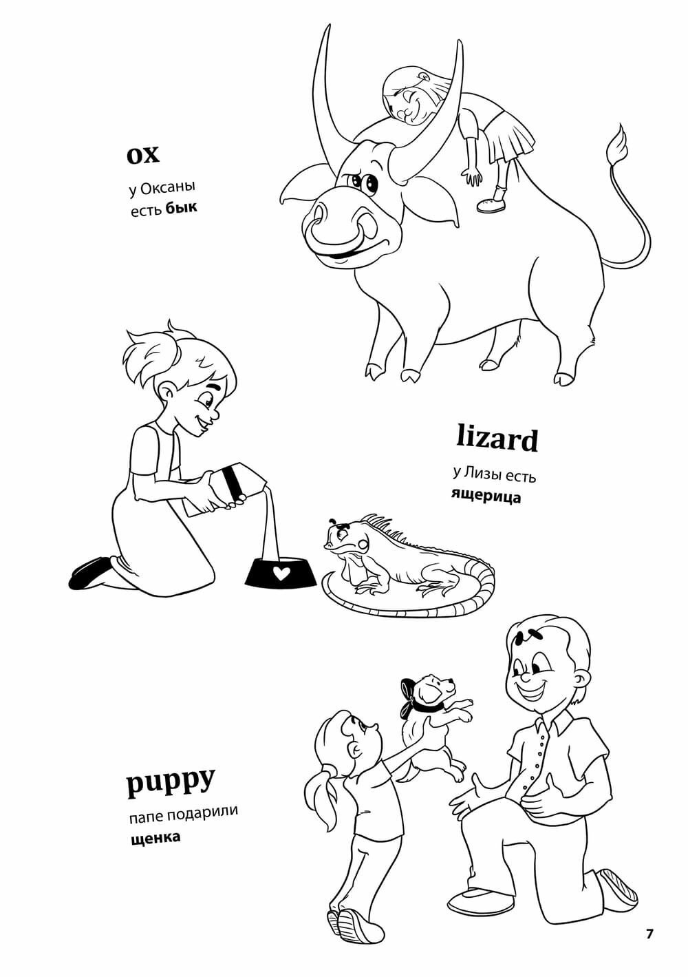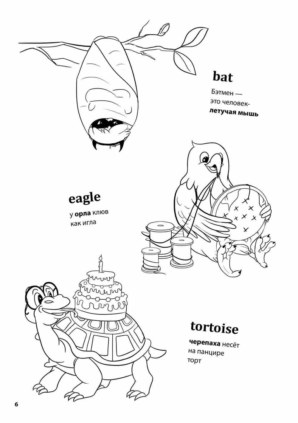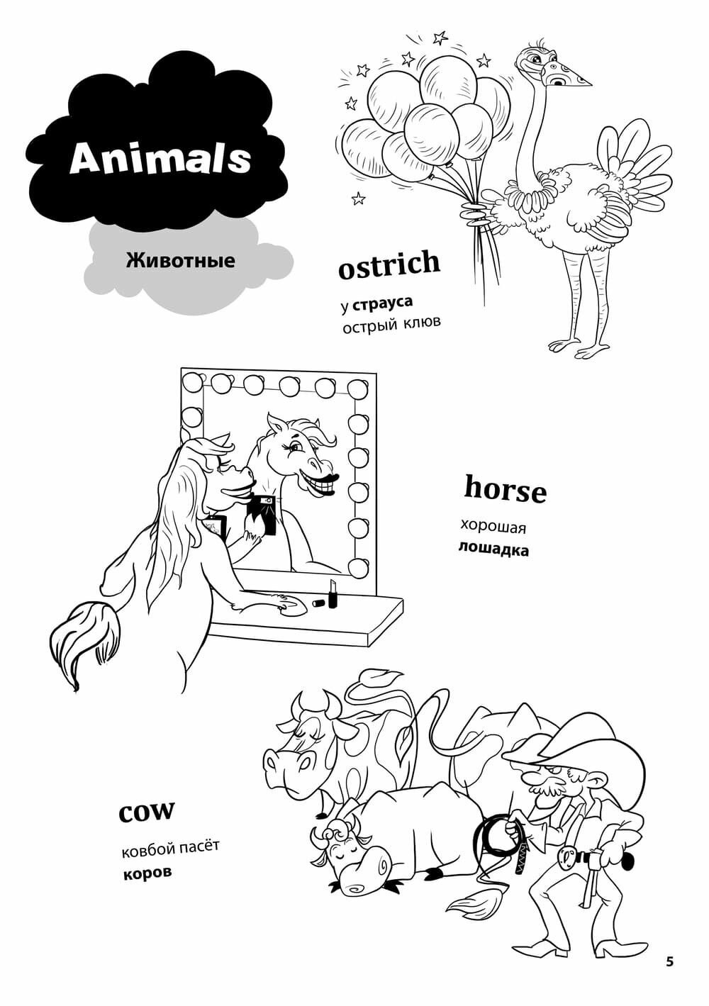 Автор книги предлагает попробовать ассоциативный прием заучивания новой лексики. Взрослый читает ребенку слово на английском языке и проговаривает фразу на русском, которая созвучна с иностранным словом. Родной язык звучит понятно, ребенок представляет образы и легко запоминает слова благодаря веселым рисункам художника. Английское слово написано крупными буквами, и малыш раскрашивает картинку. Срабатывают зрительная и слуховая ассоциации. Вот тот самый удачный прием обучения через игру, который сегодня очень популярен в развитии малышей.
