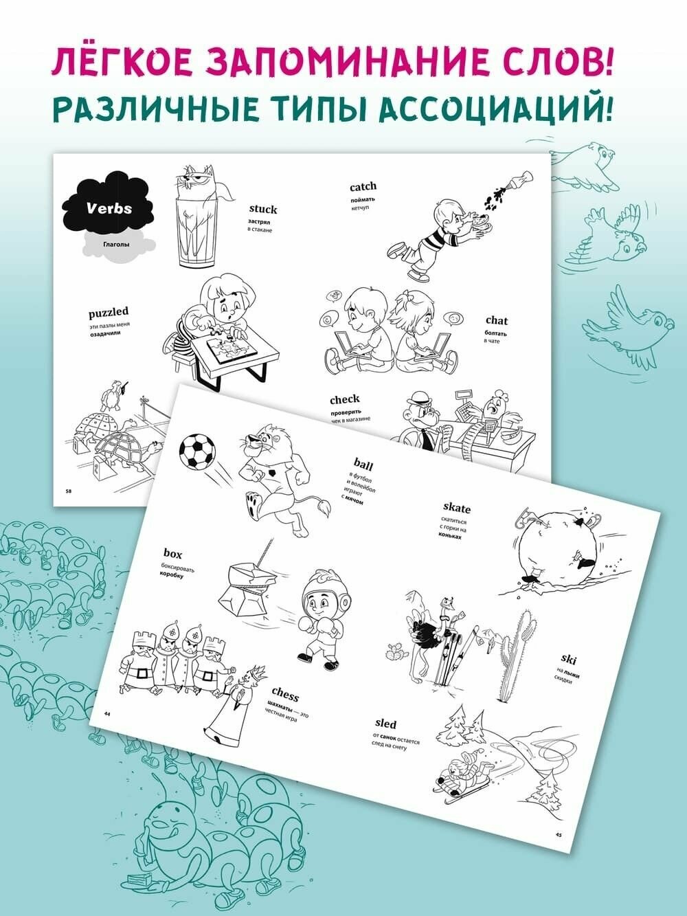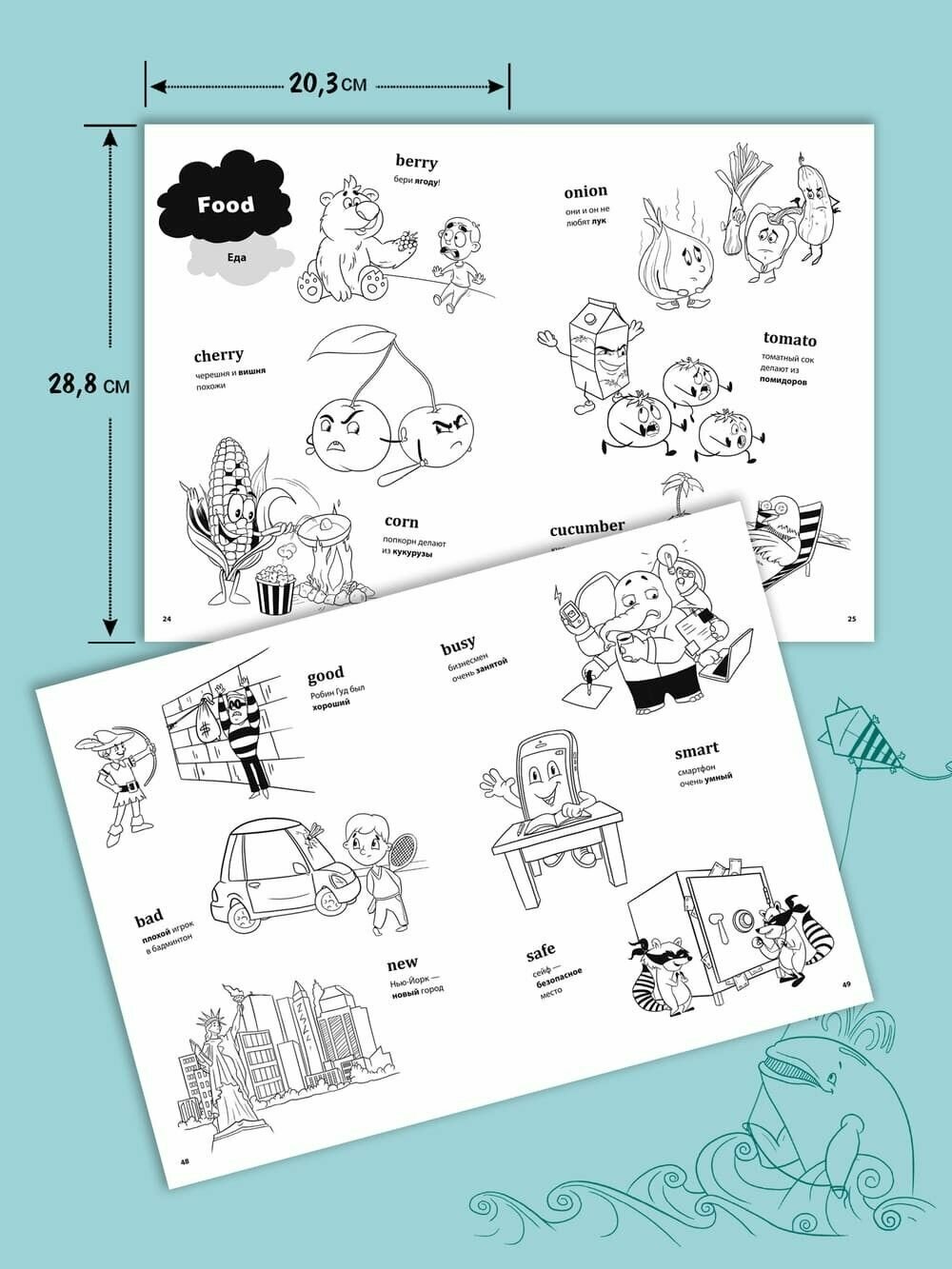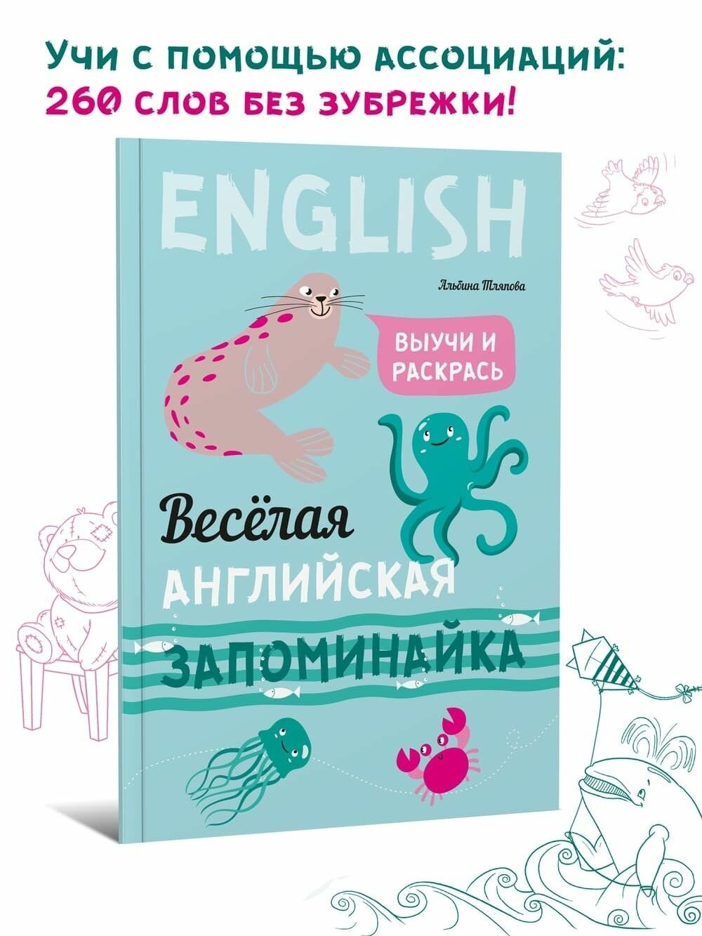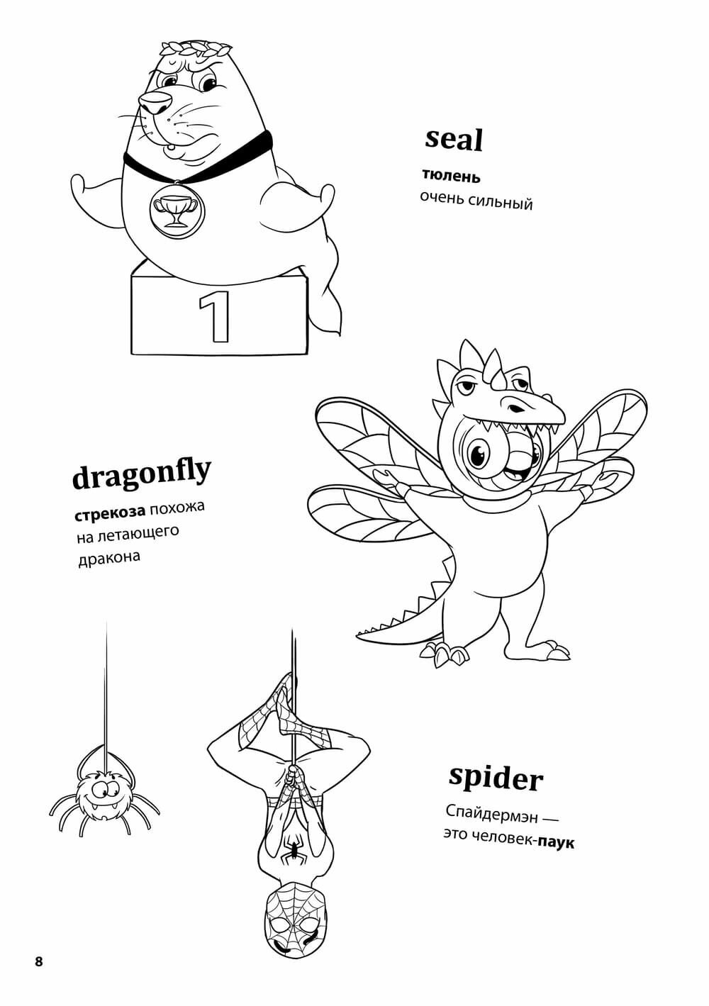 Автор книги предлагает попробовать ассоциативный прием заучивания новой лексики. Взрослый читает ребенку слово на английском языке и проговаривает фразу на русском, которая созвучна с иностранным словом. Родной язык звучит понятно, ребенок представляет образы и легко запоминает слова благодаря веселым рисункам художника. Английское слово написано крупными буквами, и малыш раскрашивает картинку. Срабатывают зрительная и слуховая ассоциации. Вот тот самый удачный прием обучения через игру, который сегодня очень популярен в развитии малышей.