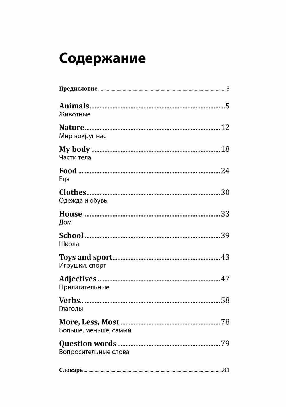 260 слов, данных с транскрипцией в конце книги, охватывают традиционные лексические темы: Части тела, Животные, Еда, Одежда, Дом, Игрушки, Спорт, Школа. Кроме того, ребенок по-знакомится со словами - признаками, со словами - действиями, с вопросительными словами и словами, при помощи которых можно сравнивать предметы.