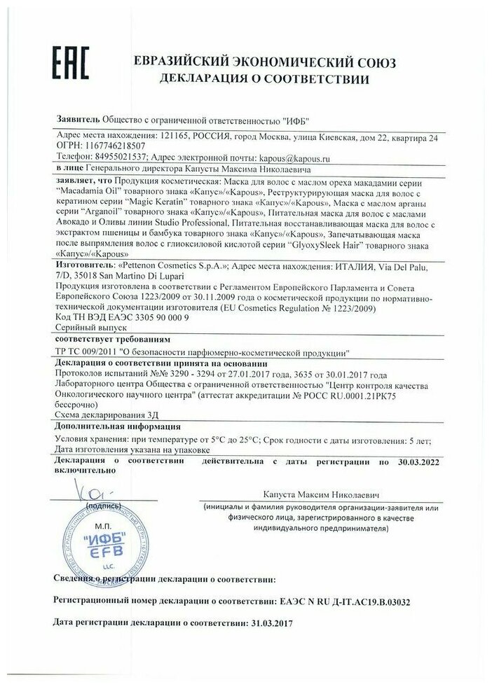 | Назначение | Глубокое восстановление волос, Увлажнение и питание волос, Естественный блеск и эластичность |