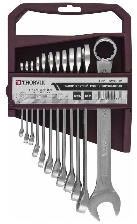 Набор комбинированных ключей THORVIK 6-22 мм, 12 предметов 52046 пригодится в гараже, мастерской при ремонтных работах. Корпус инструментов изготовлен из хромованадиевой стали, которая обладает долгим сроком службы. Хромоникелевое покрытие защищает их от коррозии. Ключи размещены в пластиковом держателе, что облегчает их транспортировку и хранение.