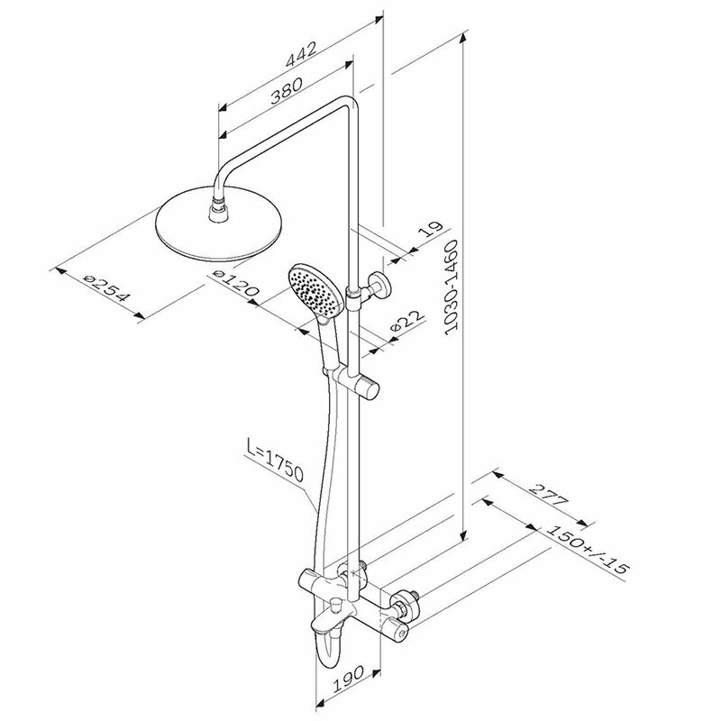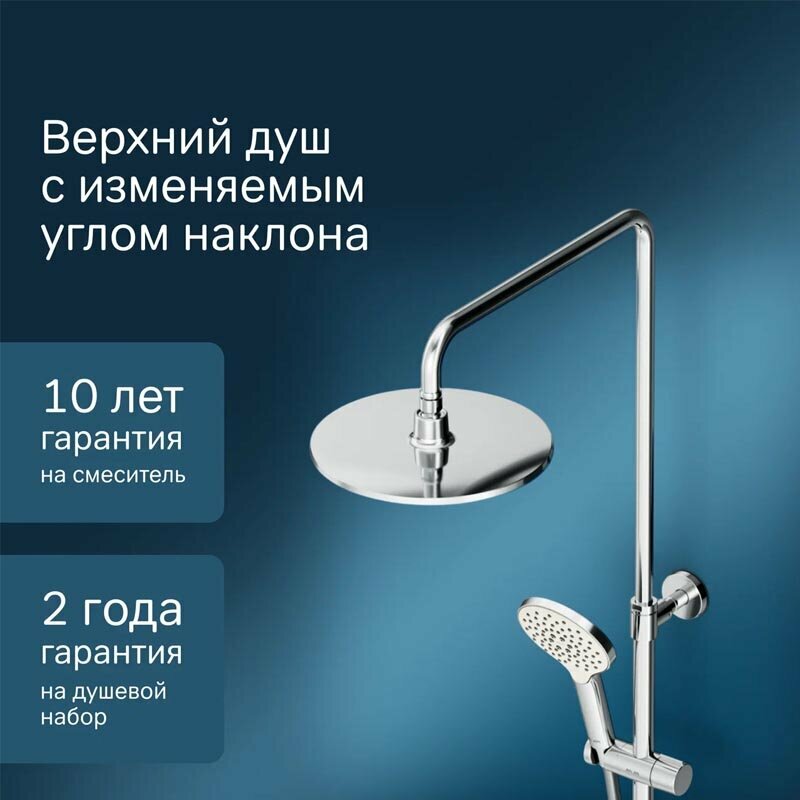 Продуманные детали для удобства использования: штанга регулируется по высоте в диапазоне от 1030 до 1460 мм, обеспечивая комфорт для людей любого роста, шаровый шарнир в держателе верхнего душа позволяет регулировать угол его наклона, душевой шланг 1750 мм, верхний душ диаметром 254 мм, ручной душ диаметром 120 мм.