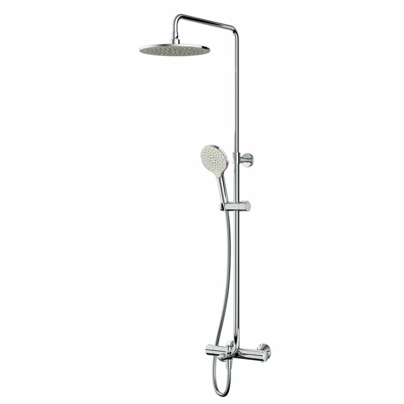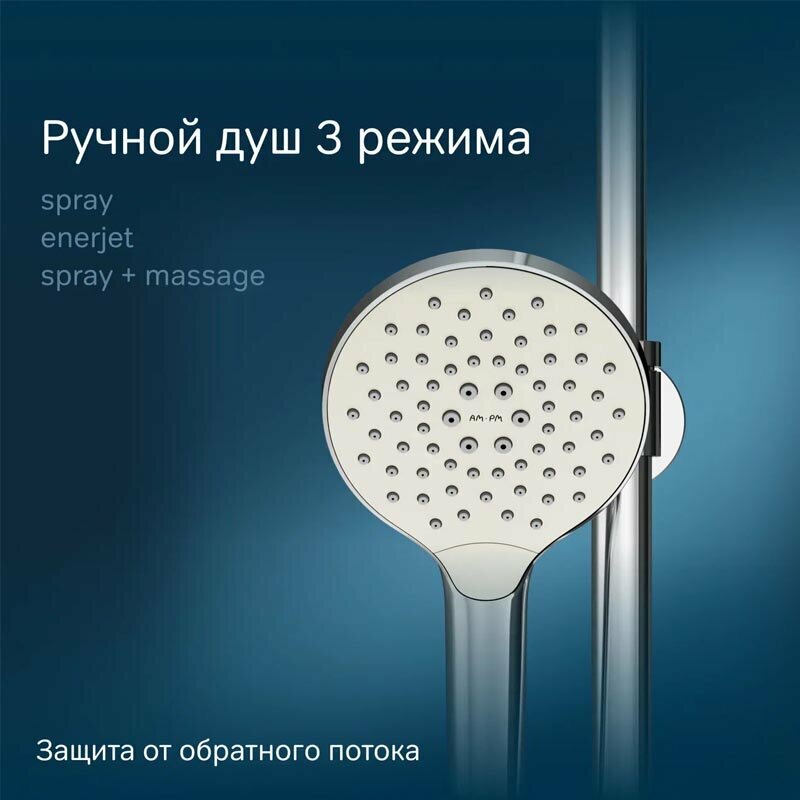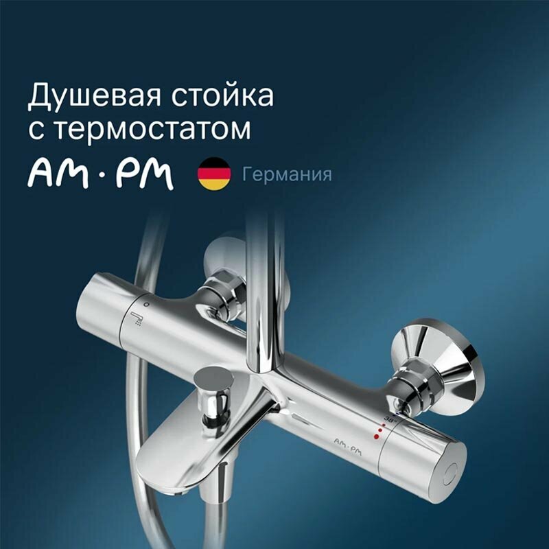 Стойка от AM.PM понравилась наличием термостата и тем, что в комплекте есть ручной/верхний душ+смеситель. Смеситель двухрычажный, вентили крутить комфортно. У верхнего душа 1 режим, у ручного 3. Переключение поворотное, простое. Есть антиеизвестковое покрытие. Ручной душ отрегулировать по высоте не проблема.термостат