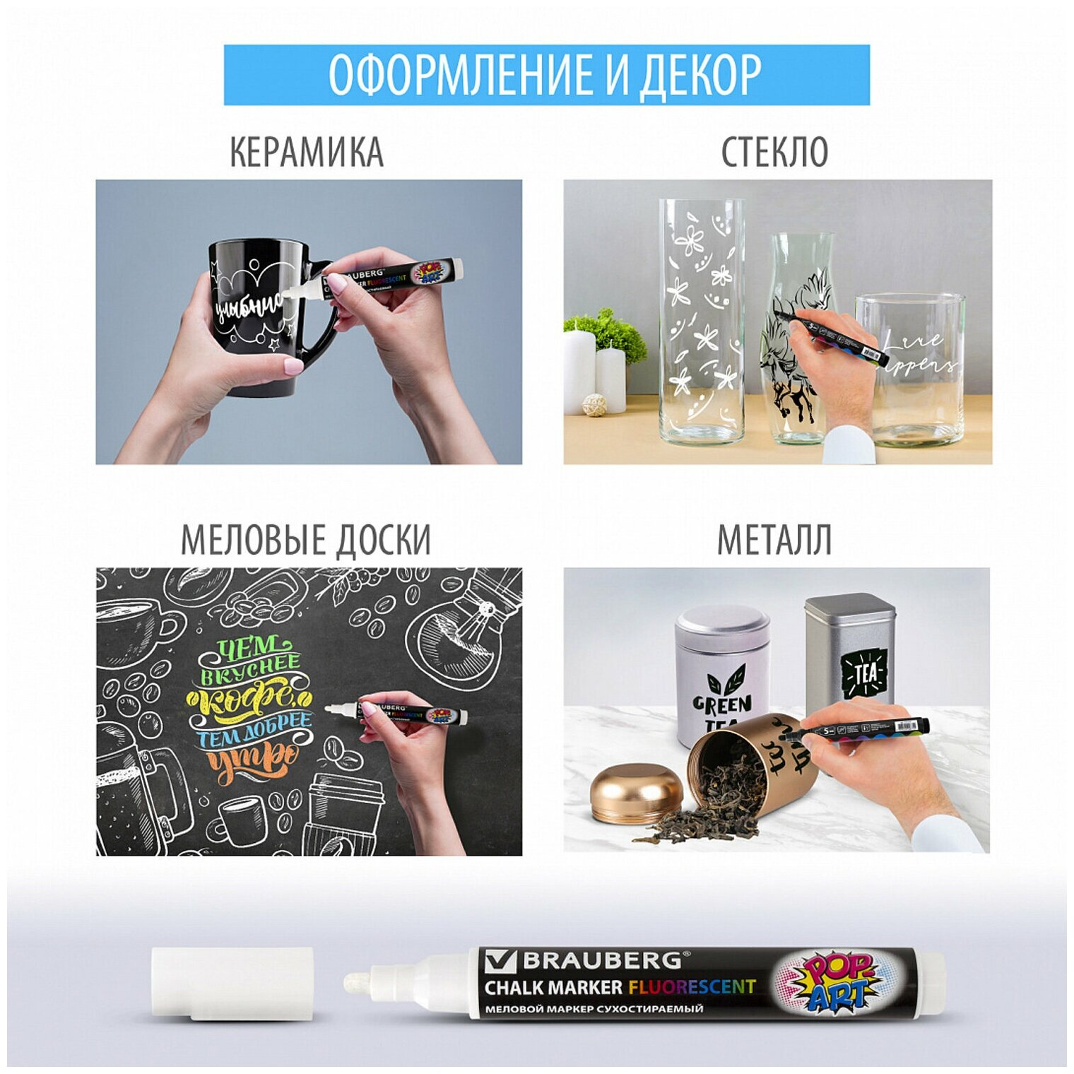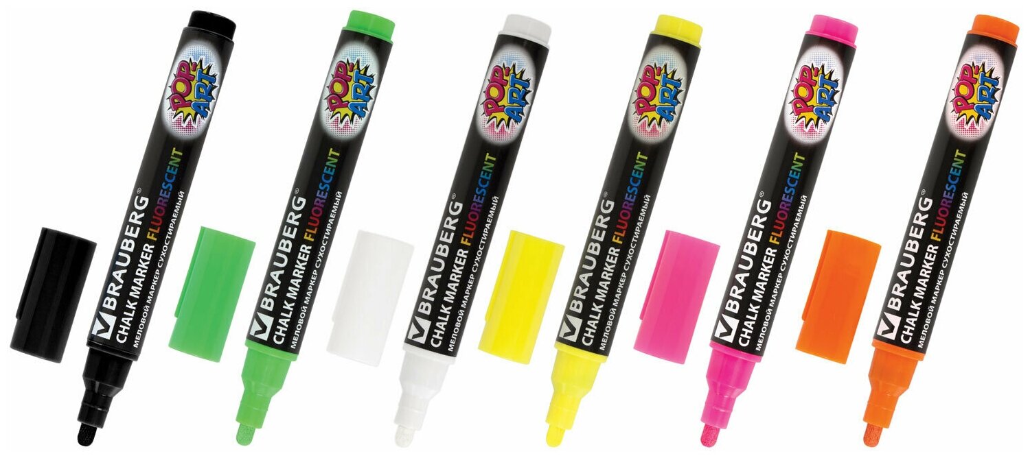 На сегодняшний день товар «Сухостираемые меловые маркеры для гладких поверхностей BRAUBERG Pop-Art Маркеры меловые 5 мм 6 шт.» можно купить с кешбеком в 1 магазине: Яндекс.Маркет