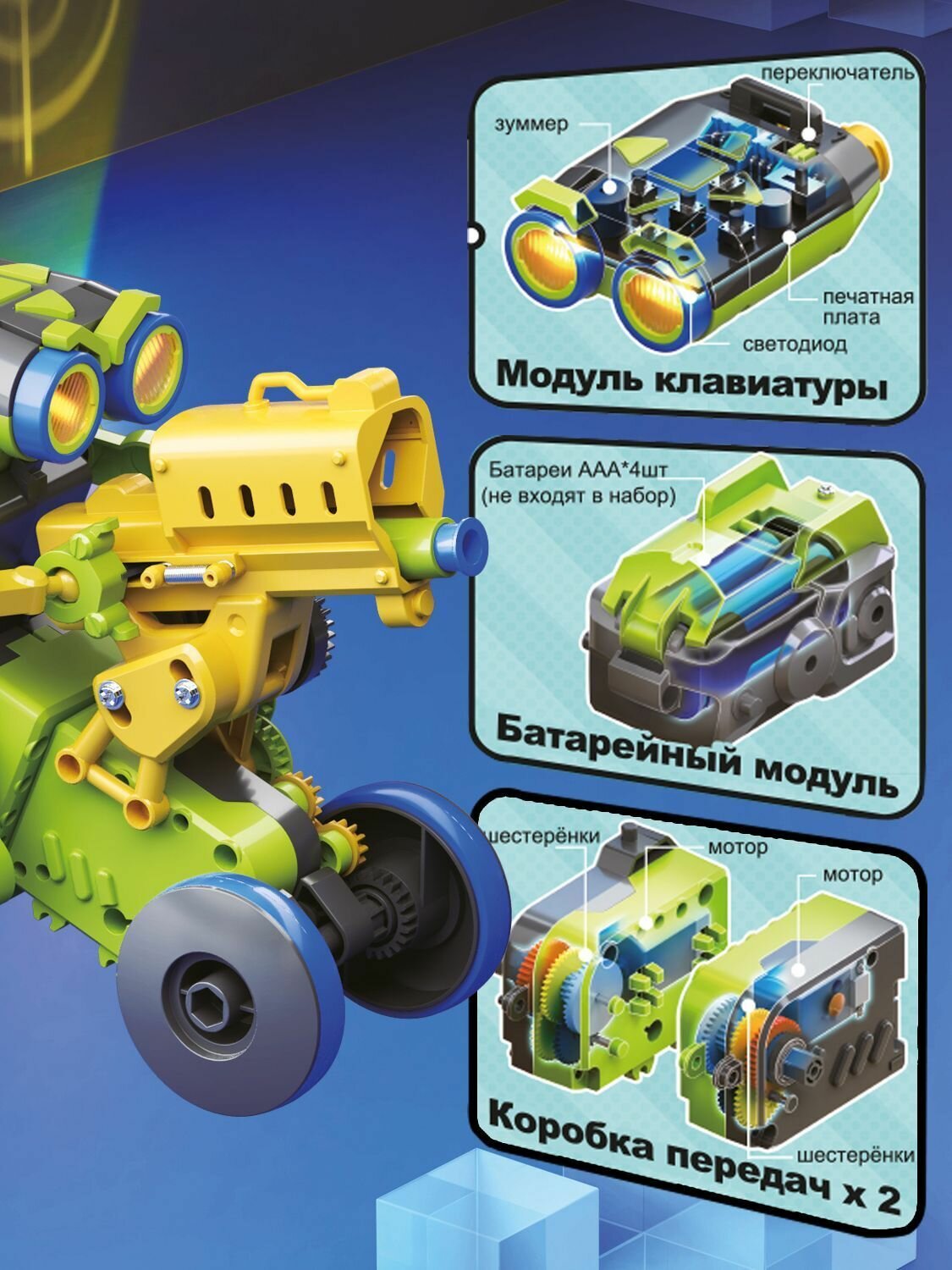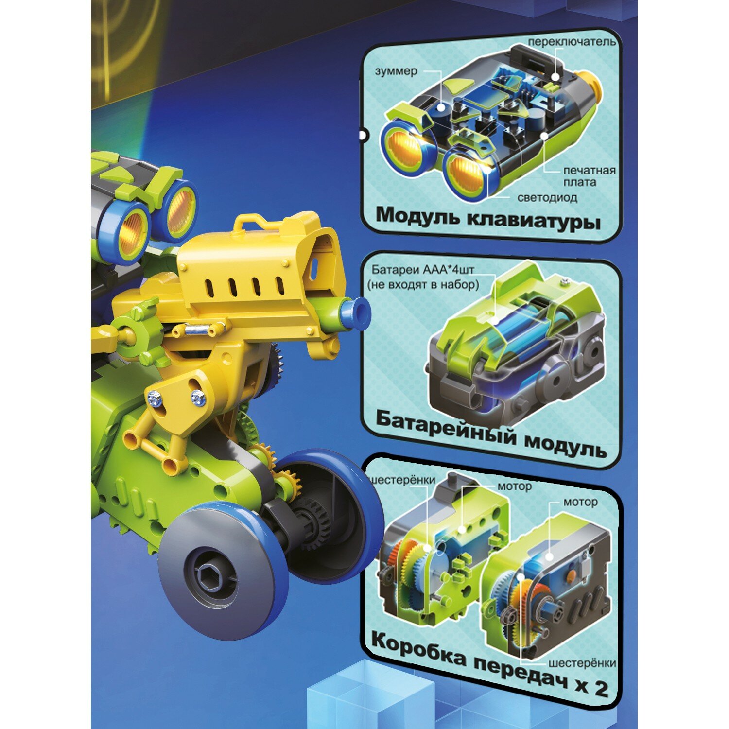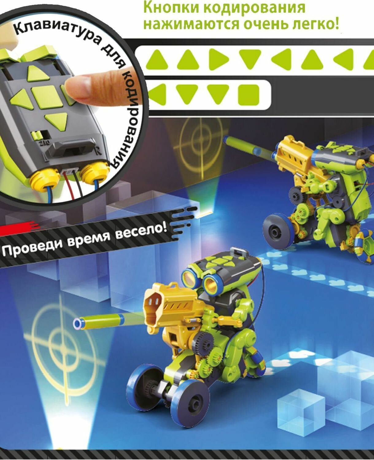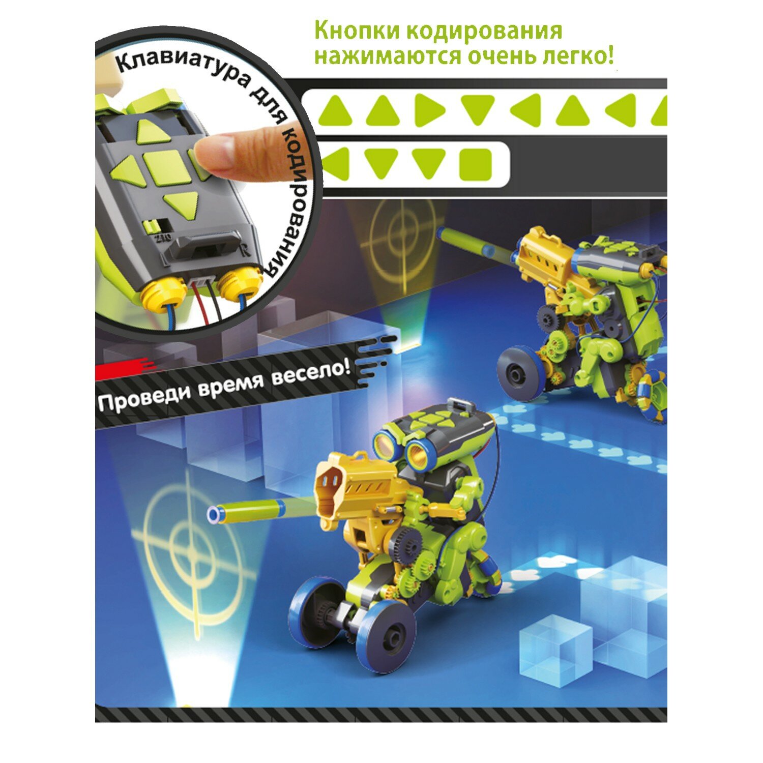 Ты можешь собирать и переставлять все части робота в 3 разных конструкциях: Стрелок, Художник и Уборщик. Робот не требует подключения к электросети, его кодирующая система находится в верхней части его головы, и дети могут легко запрограммировать его на выполнение каких-либо действий, а понять, как это делать, не составит большого труда!