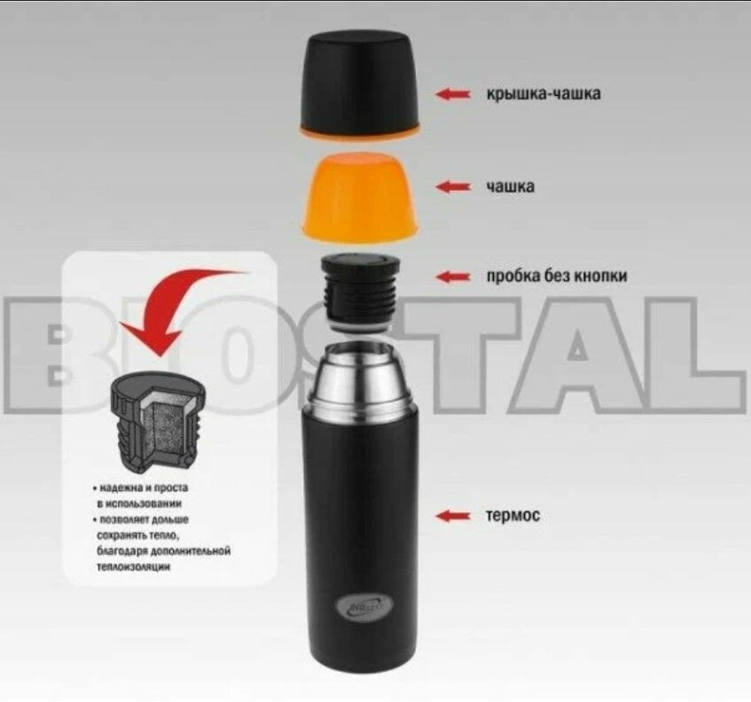 Время сохранения температуры 19 ч Объем 1,2 л Характеристики термосов Biostal Отличные эксплуатационные свойства – термосы изготовлены из высококачественной нержавеющей стали, но при этом имеют легкий вес. Хорошая теплоизоляция– термосы долгое время поддерживают начальную температуру еды и напитков. Подходят для хранния как горячих так и холодных напитков и продуктов. Удобная комплектация – каждая модель имеет пробку с внутренней термоизоляцией, стальную чашку-крышку и дополнительную пластиковую чашку.