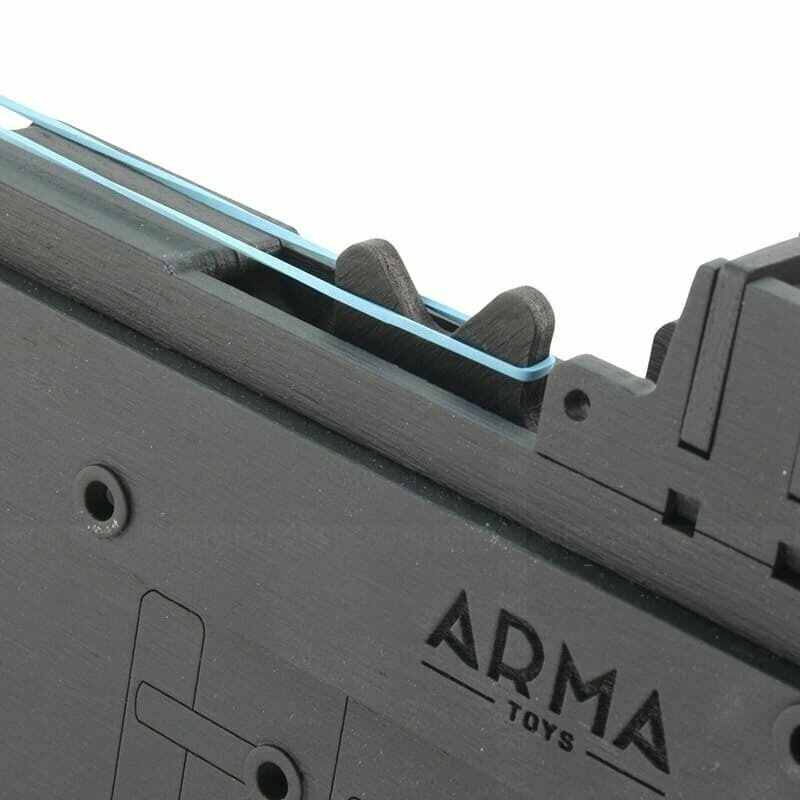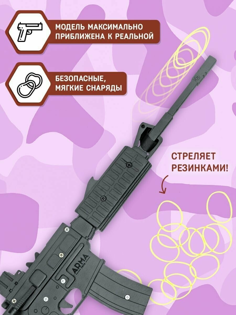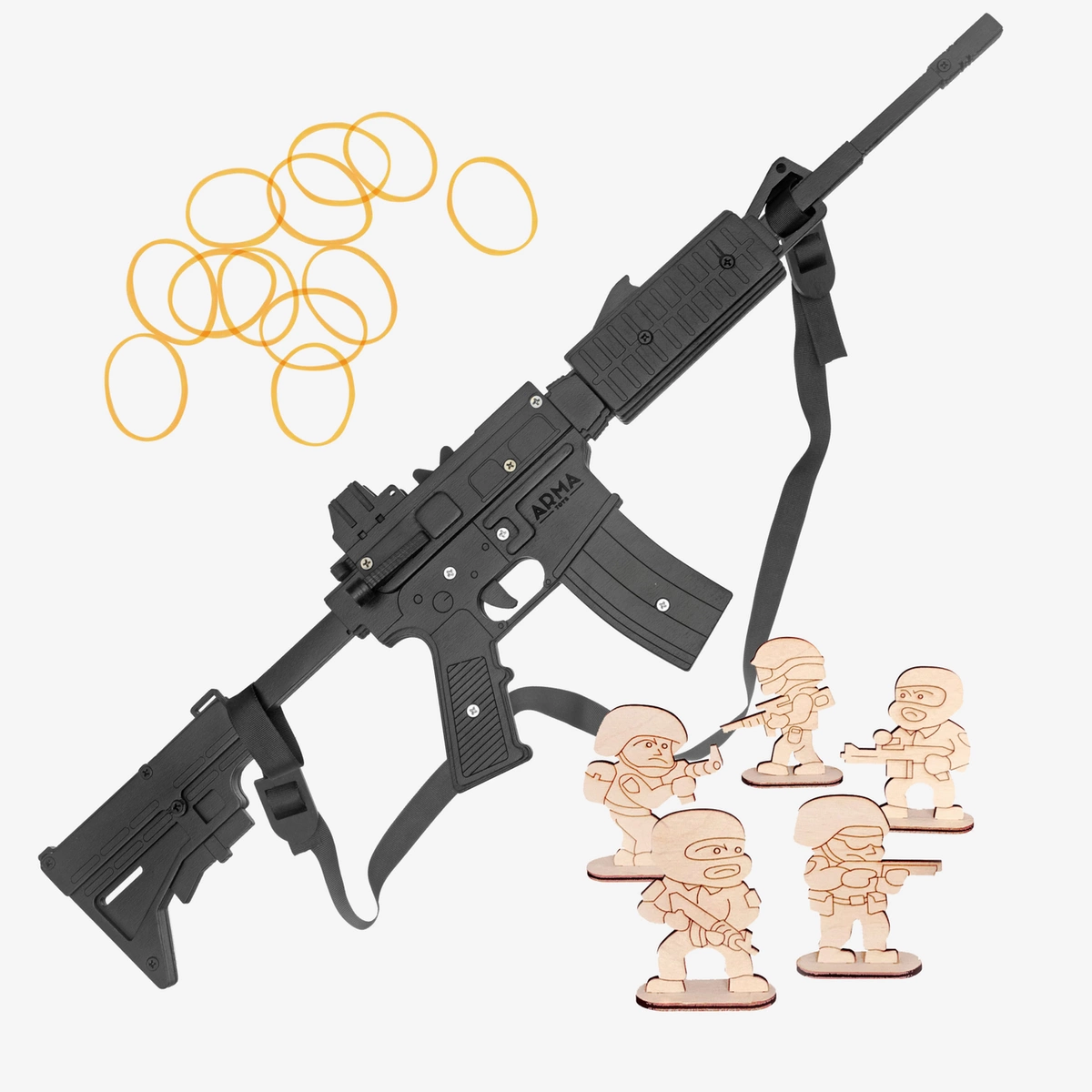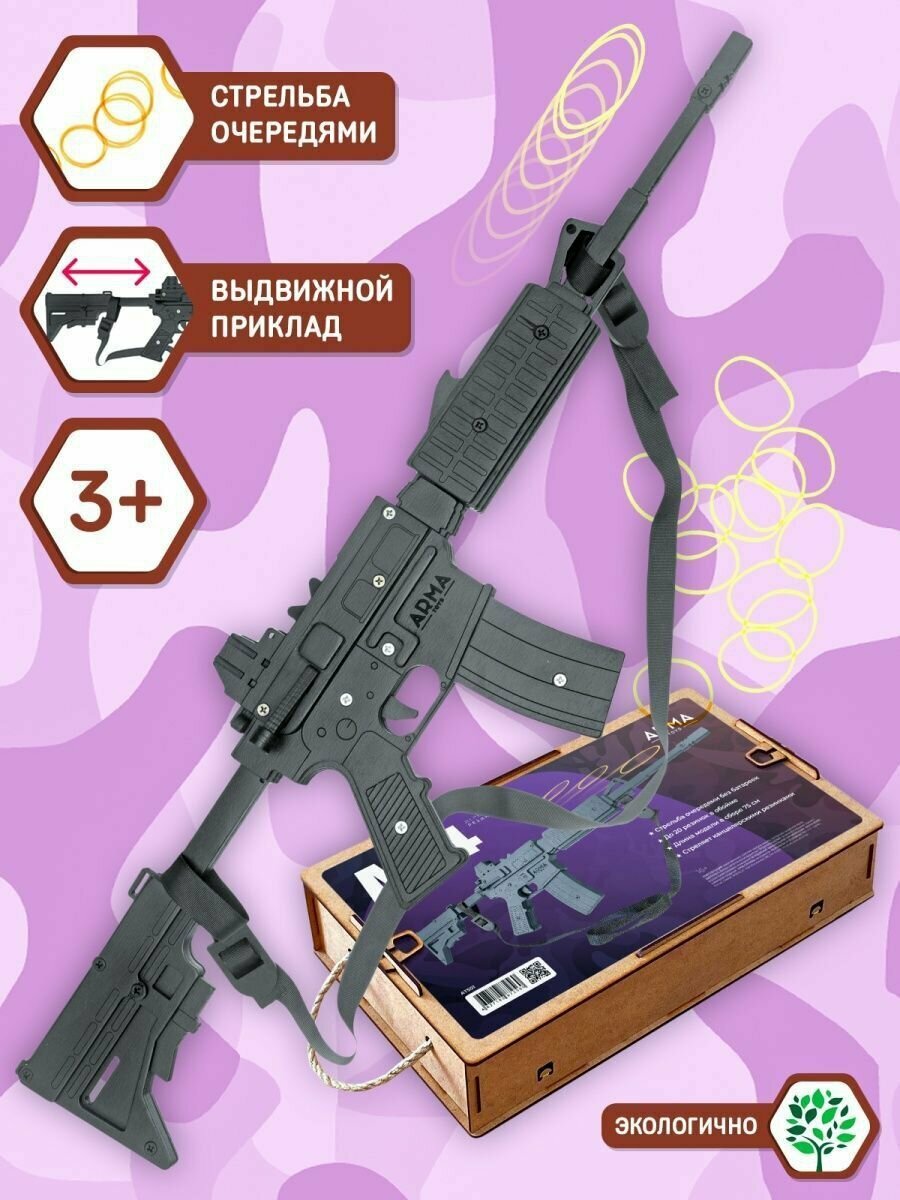 Резинкострел в форме американской винтовки из семейства “М-4” - редкая на российском рынке игрушка. Деревянная и в такой сумасшедшей деталировке - особенно.