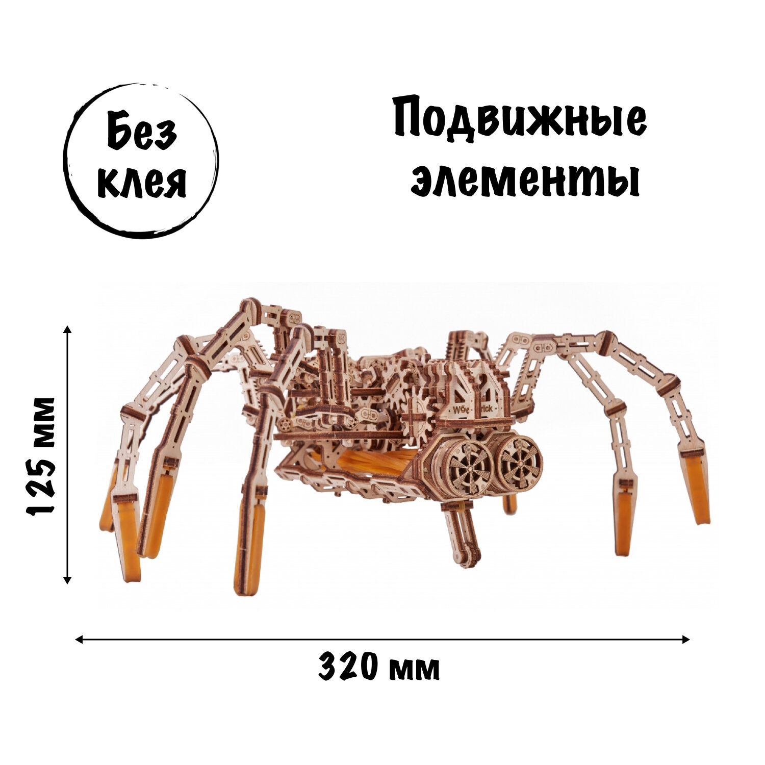 Деревянный конструктор отличается высокой детализацией исполнения. Механическая модель очень похожа на настоящего паука - шевелит лапками, быстро передвигается. Чтобы привести в движение роботизированный конструктор, Вам необходимо вращать против часовой стрелки рычаг переднего редуктора. Дополнительное улучшение работы механизма, благодаря заднему ролику.