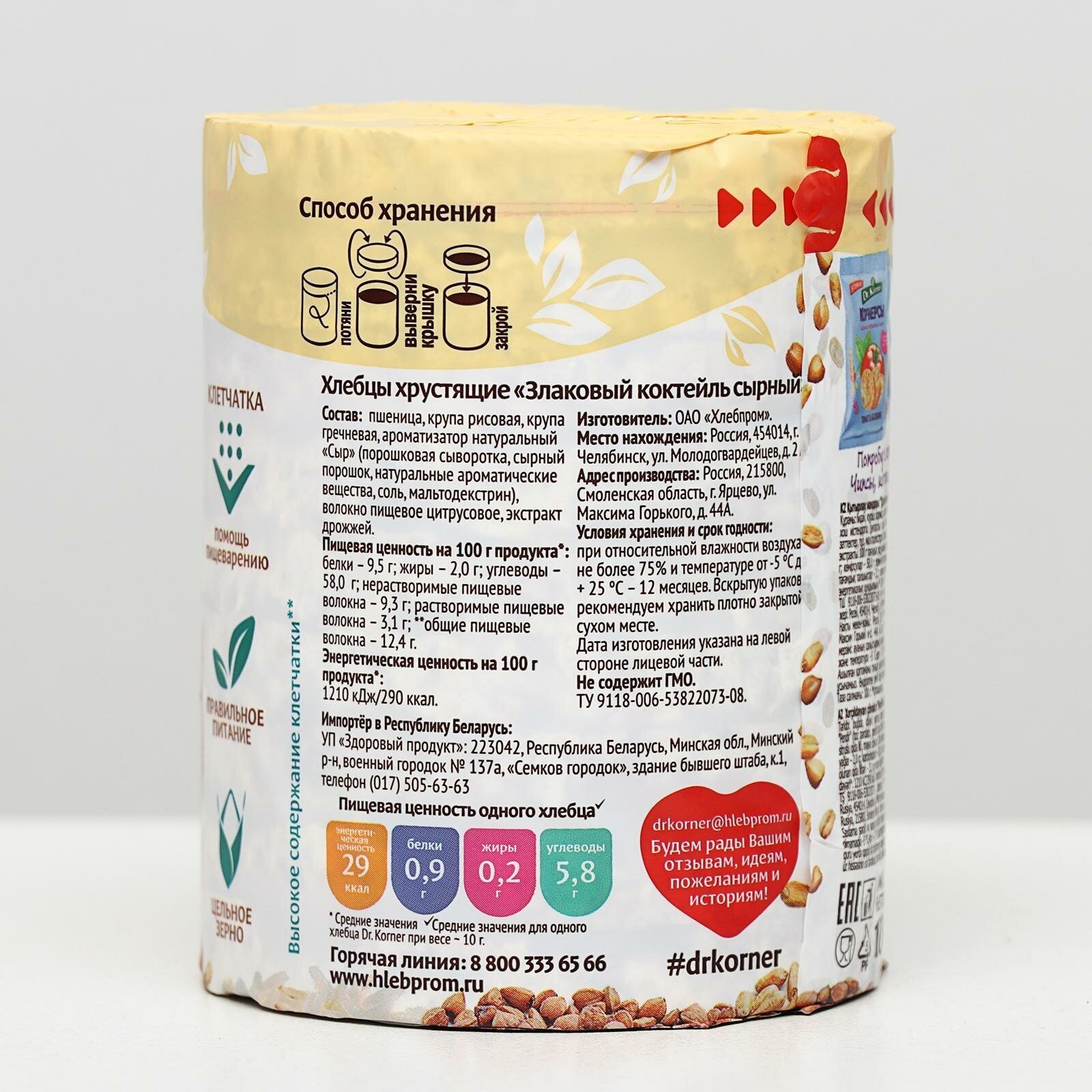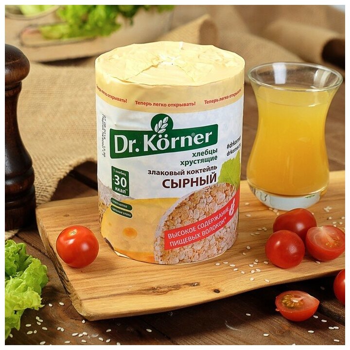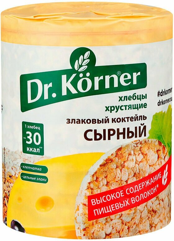 Злаковые хлебцы бренда Dr. Korner с сырным вкусом - отличная замена вредным чипсам, сухарикам и снекам. Хлебцы, обладающие приятным вкусом сырного лакомства понравятся всем ценителям настоящего сыра. Благодаря клетчатке и цельным злакам (пшеница, рис, гречка) продукт помогает выводить токсины из организма и улучшает общее самочувствие.