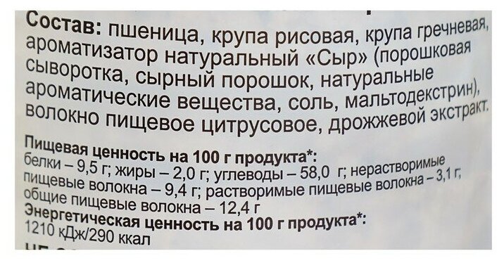 | Состав | Пшеница, крупа рисовая, крупа гречневая, ароматизатор натуральный "Сыр", волокно пищевое цитрусовое, экстракт дрожжевой. |