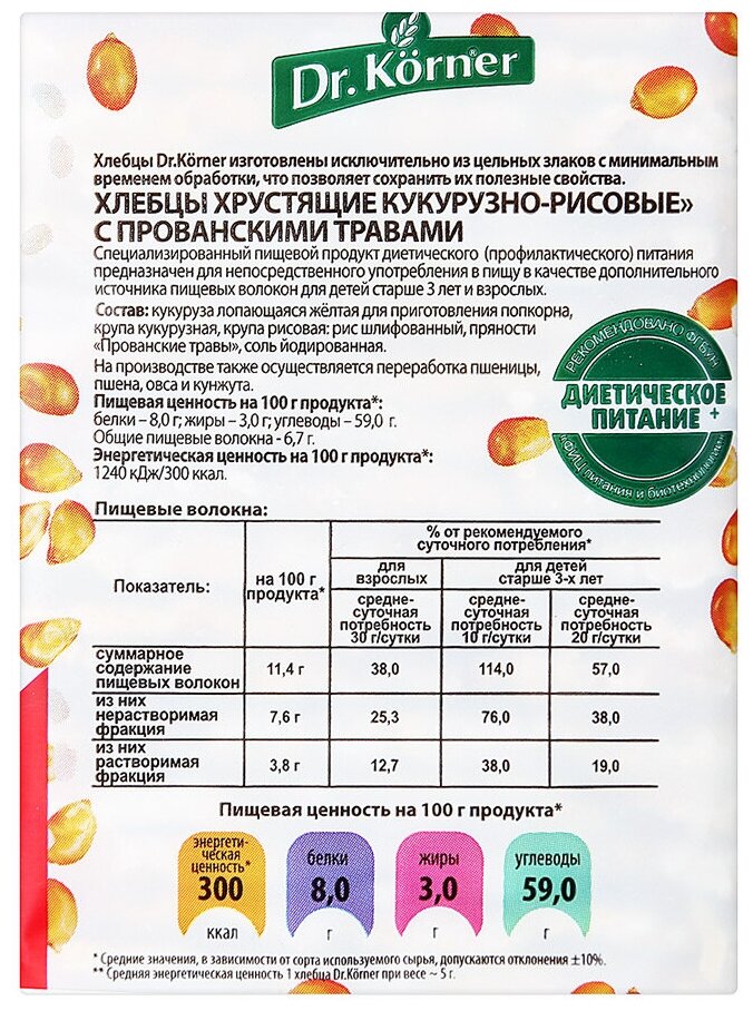 | Состав | кукуруза, крупа рисовая, пряности "прованские травы", соль йодированная. не содержит гмо. |