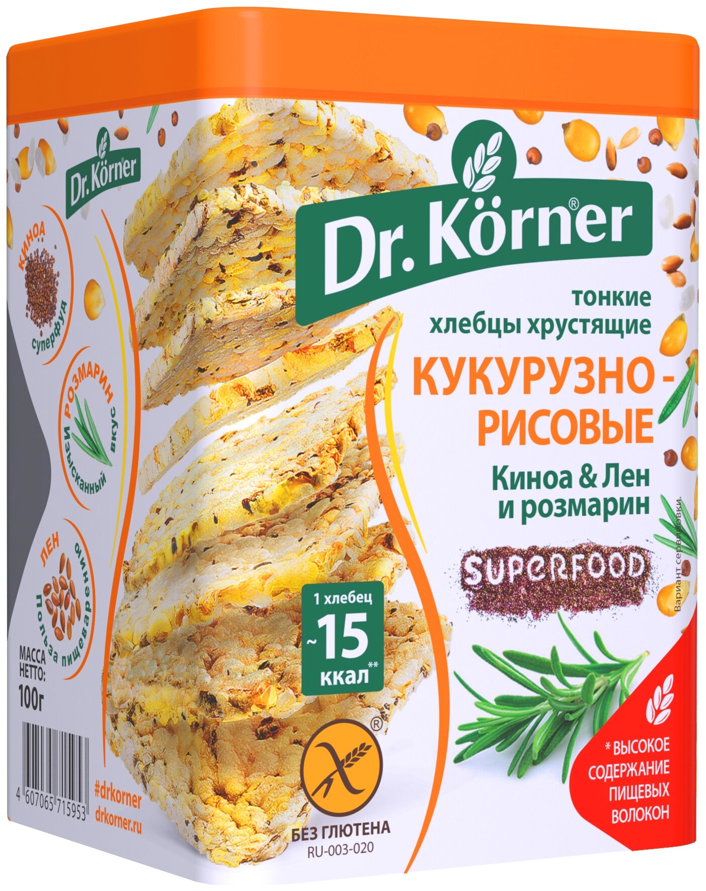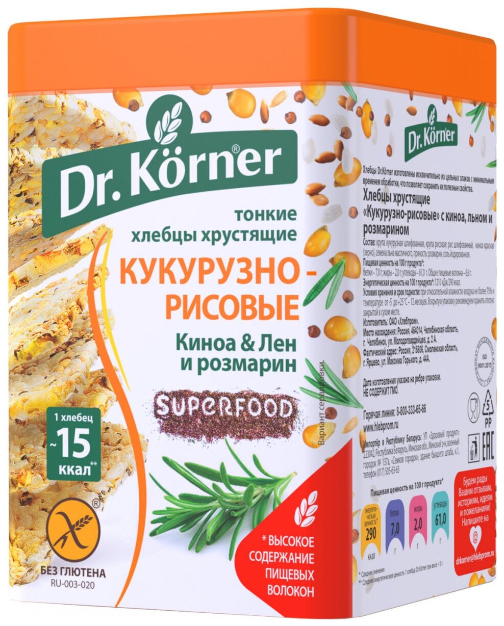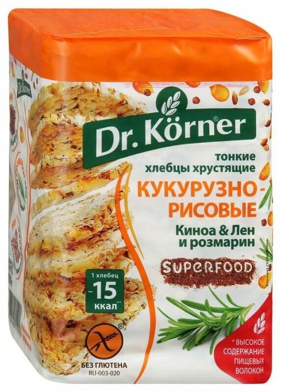 Хлебцы Dr. Korner "Кукурузно-рисовые" киноа лен и розмарин тонкие хрустящие 100гр (158275)