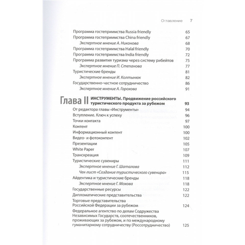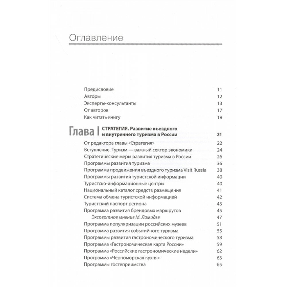 В издании представлены международный и российский опыт продвижения туристических направлений; государственные и частные проекты развития туризма; инструменты для продвижения турпродукта за рубежом; опыт пилотных национальных туристических офисов Visit Russia за рубежом; более 30 интервью с российскими и иностранными экспертами; практические примеры, полезные заметки, отраслевая статистика.