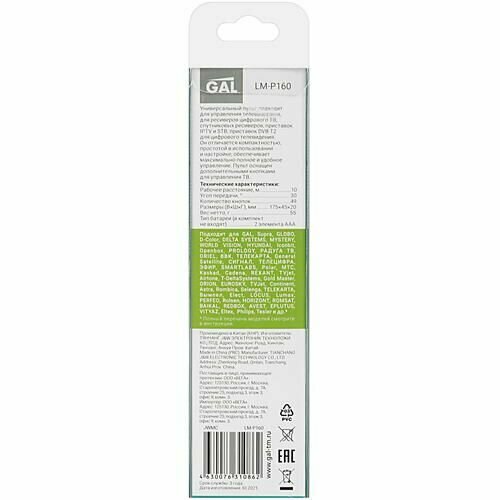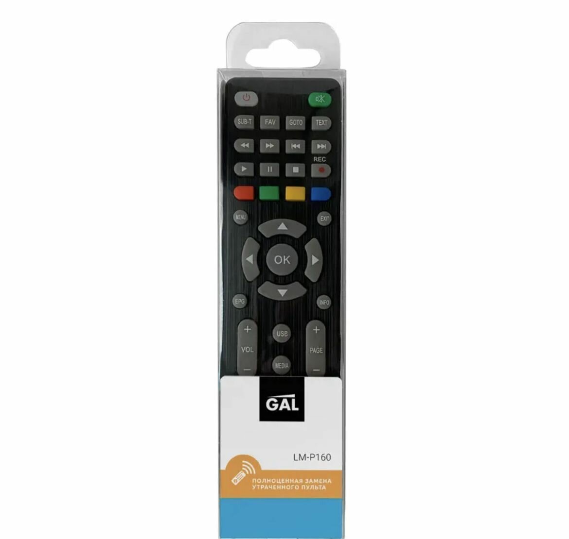 Пульт GAL предназначен для замены вышедшего из строя или утраченного штатного пульта. Подходит для ресиверов цифрового ТВ, спутниковых ресиверов, приставок IPTV и STB, приставок DVB-T2 для Цифрового телевидения. Универсальный пульт обеспечивает максимально полное и удобное управление. Модель удобна и проста в настройке.
