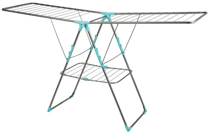 Имеет удобный механизм раскладывания. Материал устойчив к коррозии. может использоваться как в доме, так и на открытом пространстве. Удобные решетки позволяют развешивать большое количество вещей. Компактна в сложенном положении, что позволяет экономить место в доме.