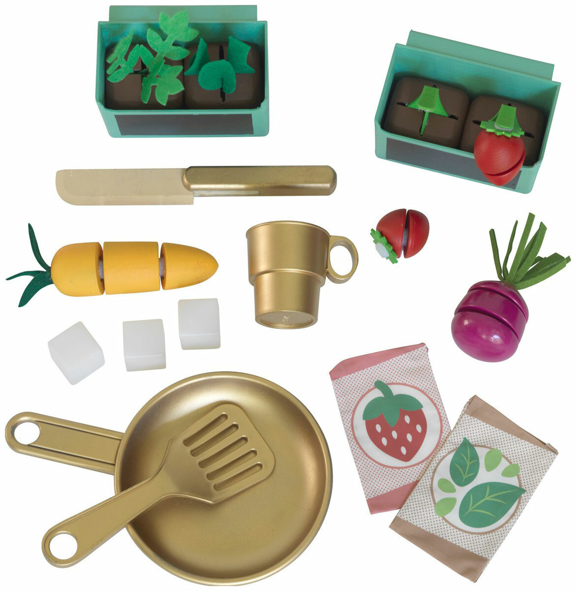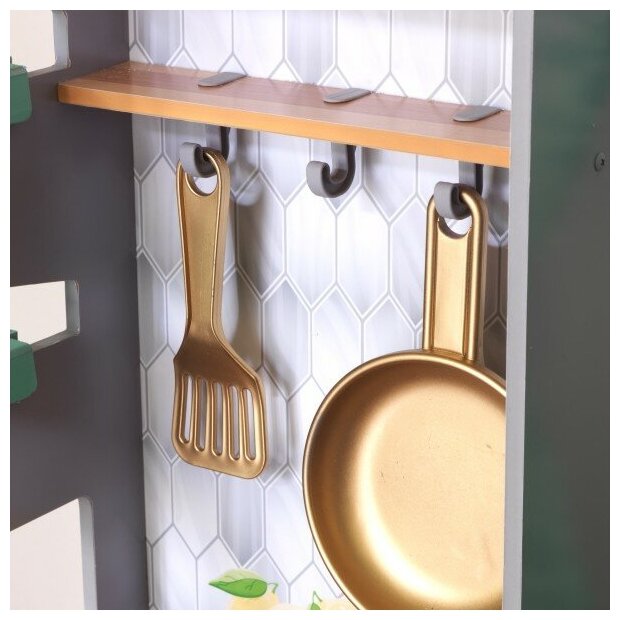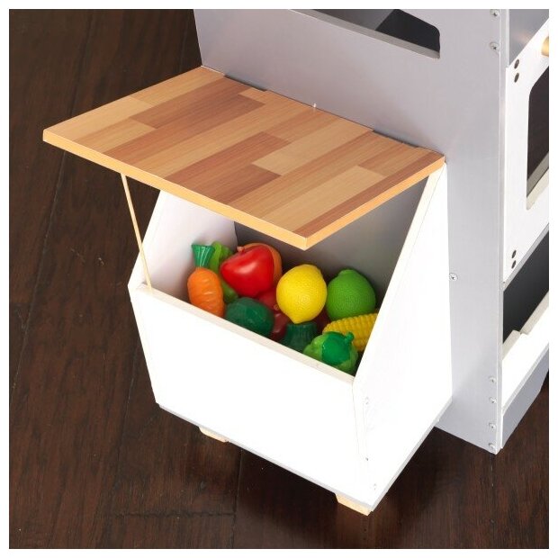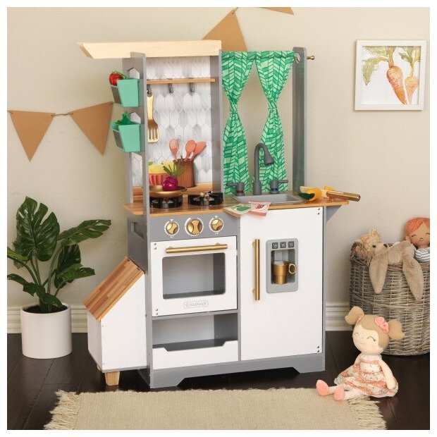 Развивайте свое воображение, собирая урожай на игровой кухне. В удобной кухня все продумано до мелочей. Рядом висят кашпо для выращивания овощей и боковой ящиком для хранения и переработки. Дети могут пройти весь процесс посадки с кубикам из искусственной грязи, пакетикам с семенами и стеблями. Есть много нарезанных фруктов и овощей, чтобы создавать удивительные рецепты. Световые и звуковые горелки плиты, работающий льдогенератор добавляют больше реализма и азарта. Свежие оттенки и тканевые шторы делают творчество еще более ярким каждый.