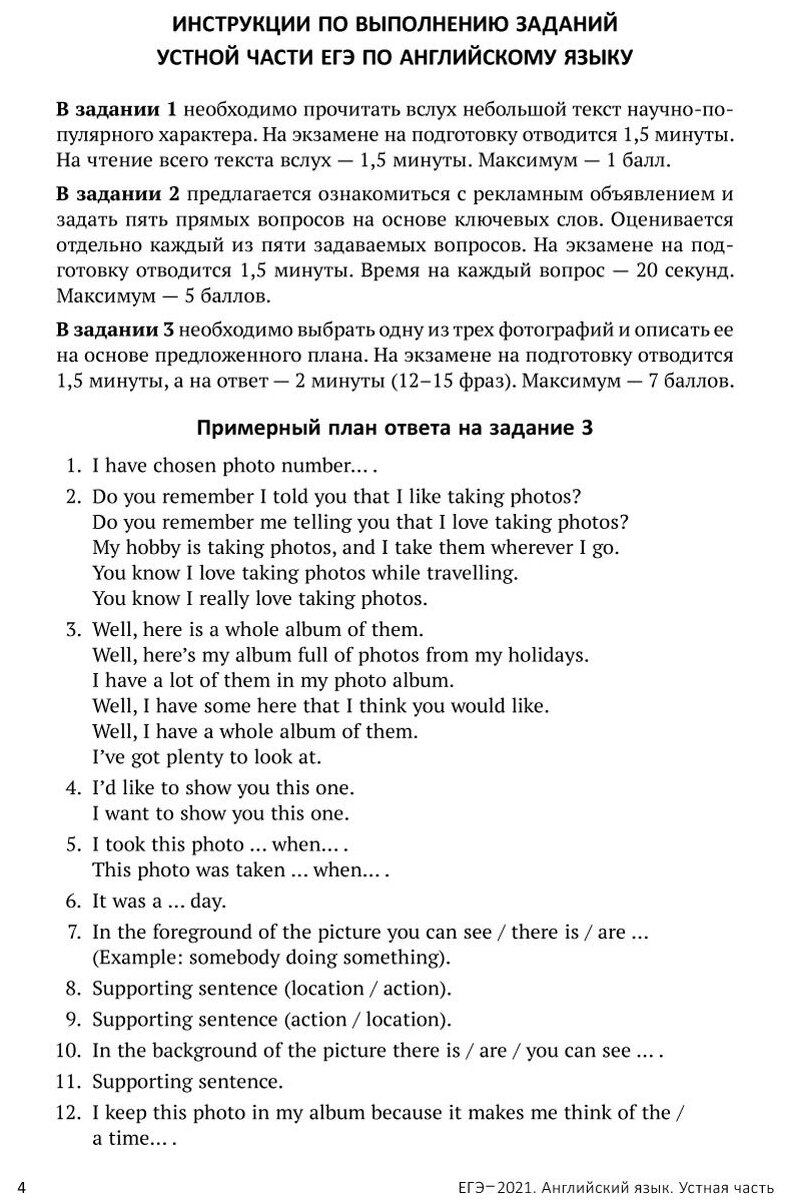 Учебное пособие содержит 25 тренировочных тестов, которые также являются демонстрационными, образцы выполнения всех заданий, инструкции по выполнению заданий, подробные планы ответов на задания 3 и 4, а также критерии оценивания выполнения заданий 1, 2, 3, 4 раздела "Устная часть".