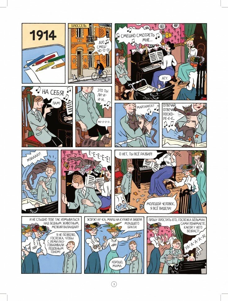 С одной стороны - довольно интересный комикс, с другой - получилось как-то галопом по Европам - очень кратко, схематично, без нюансов и подробностей . В конце книги есть приложение с кратким описанием персонажей книги - возможно стоит начинать читать комикс с этого раздела - так многое становится более понятным по ходу действия, особенно тем, кто с биографией Эрже не знаком (как я)). Рисовка, к сожалению, не очень интересная. Как написано в самой книге - изначально этот комикс был чёрно-белым - примеры ч/б рисунков есть в конце книги. Возможно после колорирования картинки утратили некоторое очарование, а возможно и до этого были довольно скучны. И да, очень много опечаток, даже на задней стороне обложки в рекламном тексте!