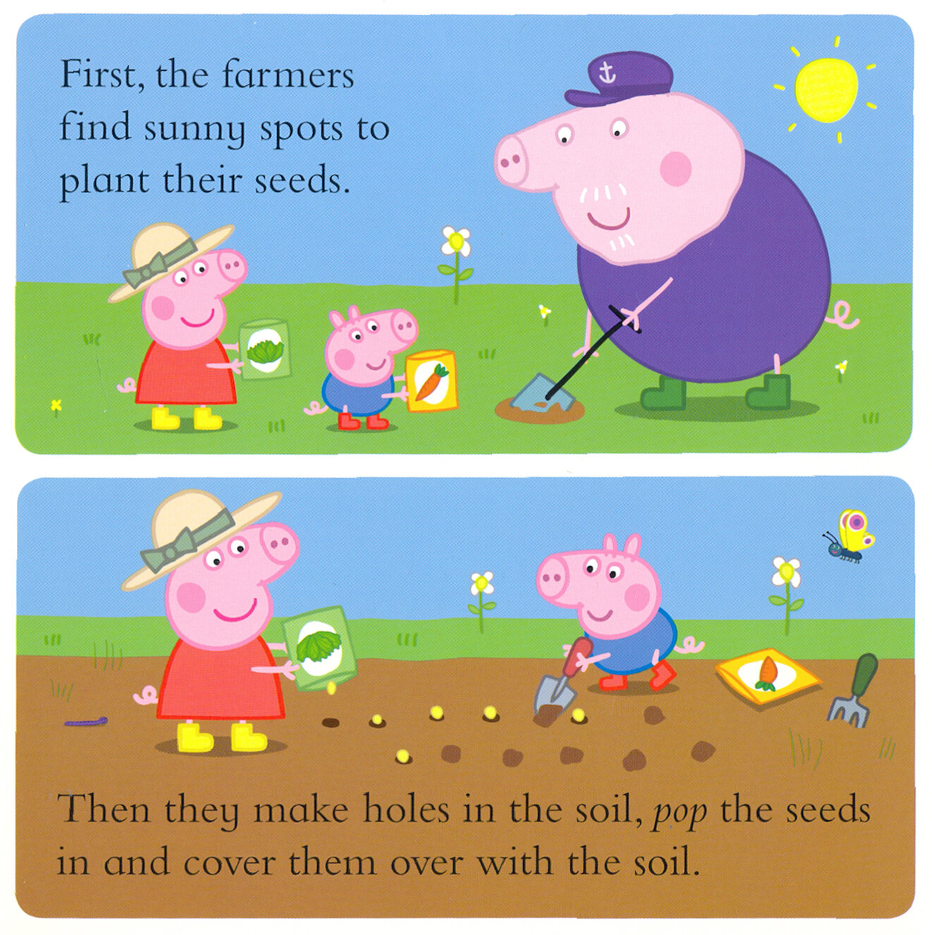Grandpa Pig loves growing vegetables in his garden, so Peppa and George want to be farmers too! They have lots of fun choosing what to grow, planting their seeds and learning to be patient waiting for them to grow. Then it's time for a delicious vegetable feast!