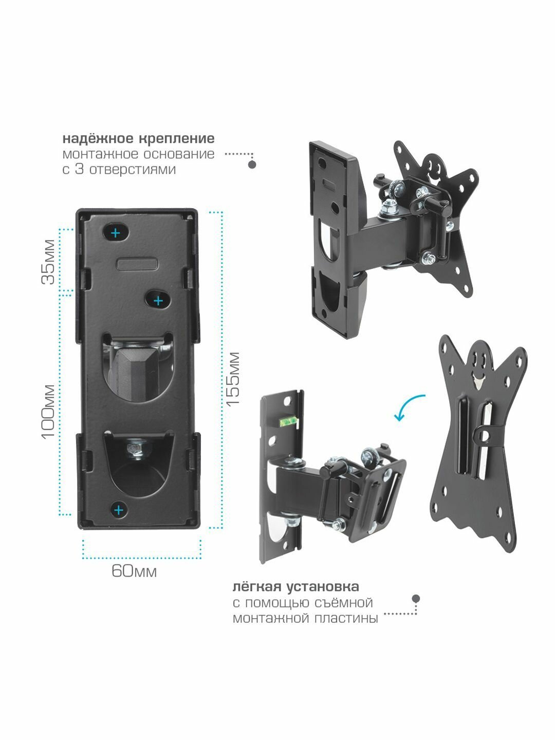 Наклонно-поворотный кронштейн для крепления к стене телевизоров и мониторов с не большой диагональю экрана. Высококачественная стальная конструкция обеспечит надежное и безопасное использование. Легко снимающаяся монтажная пластина облегчит процесс уборки.