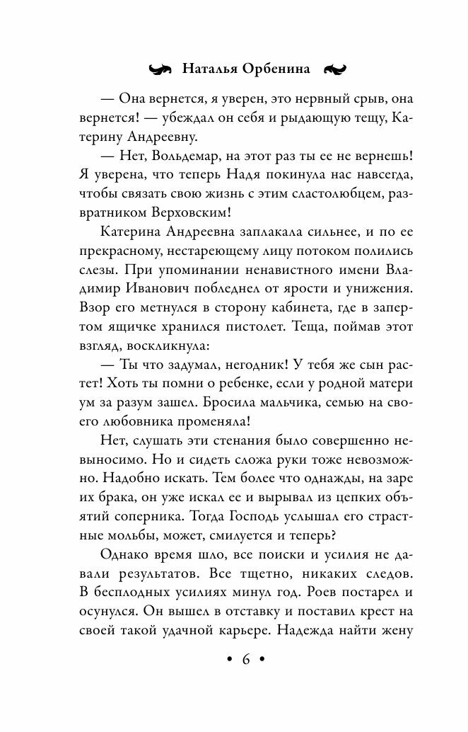 Коллежский советник Владимир Роев оказался в глупейшем для благородного человека положении. От него сбежала обожаемая им жена. Собственно, так твердила молва. Полиция придерживалась менее романтичной версии. Похоже, молодая женщина стала жертвой мошенников и убийц. Минул целый год, прежде чем Наденьку, наконец, нашли застреленной в глубоком овраге. Но что делала Надежда Васильевна одна на пустынной лесной дороге? В маленькой сумочке обнаружилась бумажка с расплывшимся едва различимым текстом. Может именно этим письмом Роеву заманили на место убийства? Кто? Евгений Верховский, Надин любовник? Но зачем, если он боготворил ее?. Действие в любовно-криминальных историях Наталии Орбениной происходит в конце XIX века. Расследования ведет петербургский сыщик Сердюков - прекрасный аналитик и сердцевед. Приключения, тайны, интриги и волшебная сила любви - все, что так нравится женщинам!