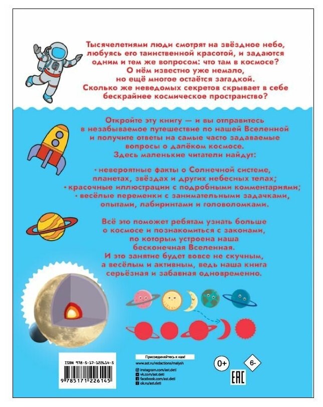 Эта книга откроет детям удивительный мир космоса, причём сделает это в весьма интересной и увлекательной форме. На её страницах ребята узнают об устройстве нашей Вселенной, Галактике и Солнечной системе с её планетами, звёздами, кометами, астероидами и другими небесными телами, найдут ответы на свои самые часто задаваемые вопросы о космосе и поймут, насколько безгранично и загадочно космическое пространство. И самое главное - здесь приведено множество занимательных задачек, опытов, ребусов, лабиринтов и головоломок, которые помогут ребёнку в игровой форме закрепить материал. Изучение любой сложной темы может быть весёлым и нескучным, и книга "Космос" именно такая - она серьёзная и забавная одновременно.