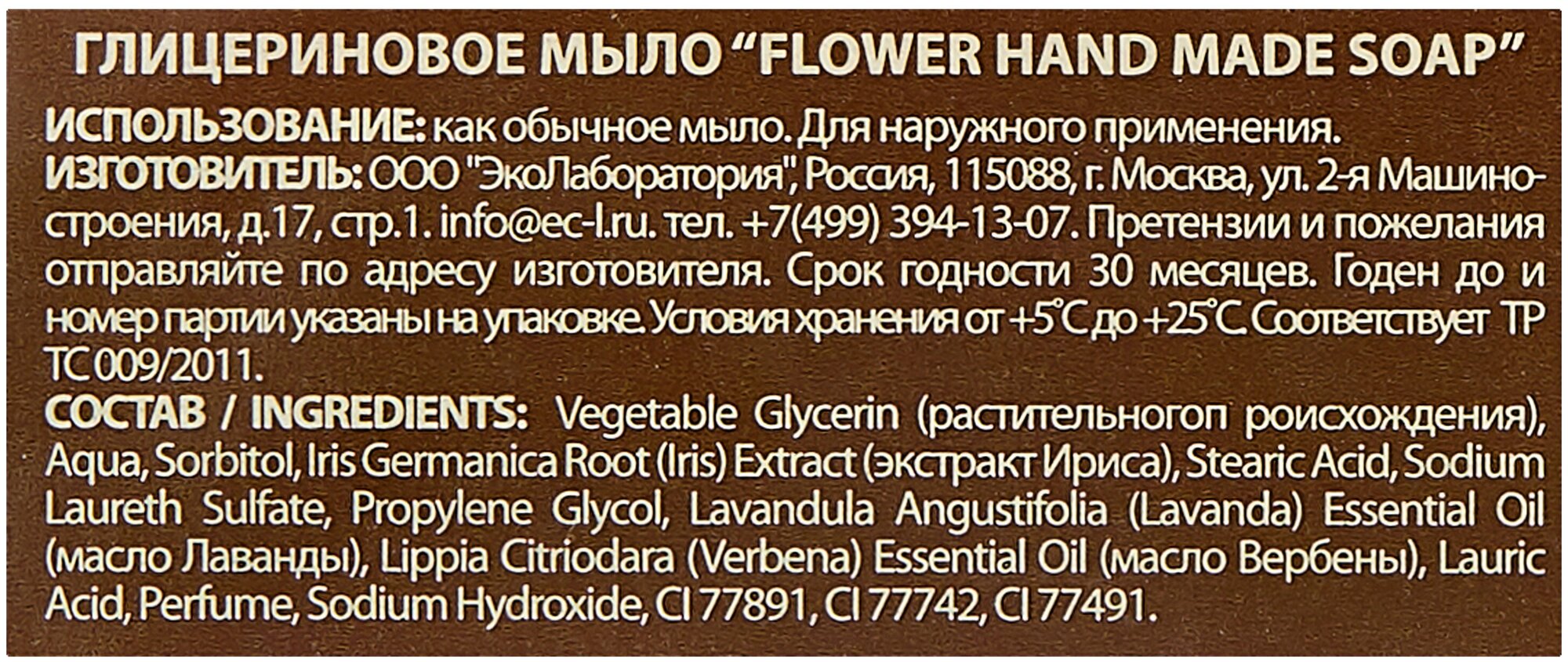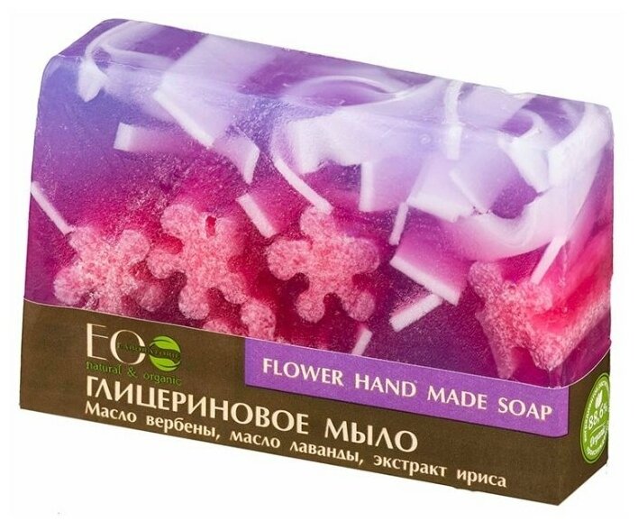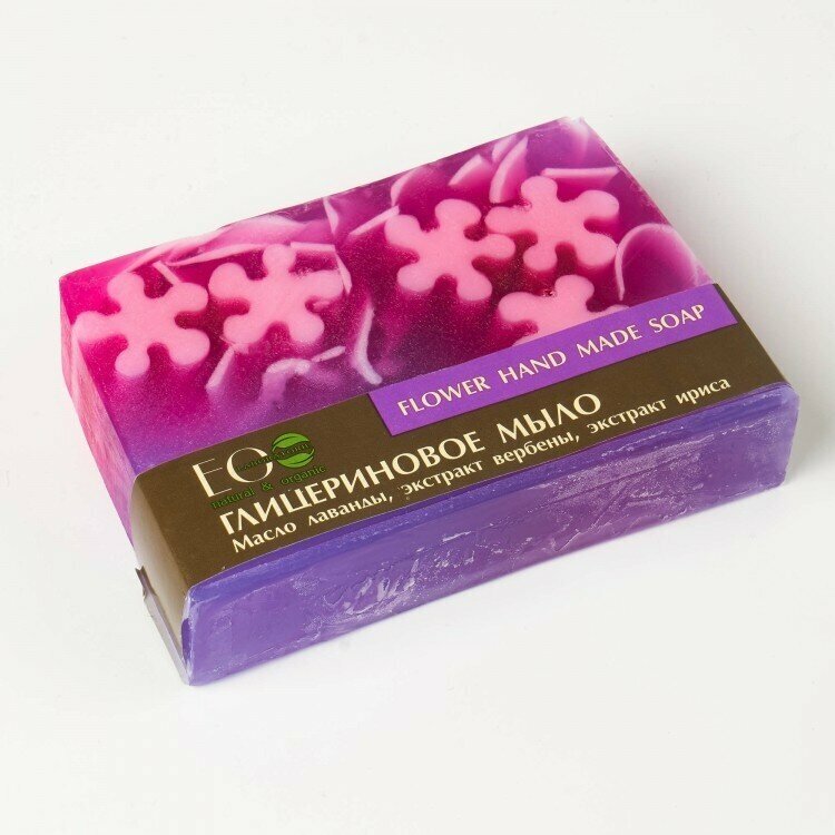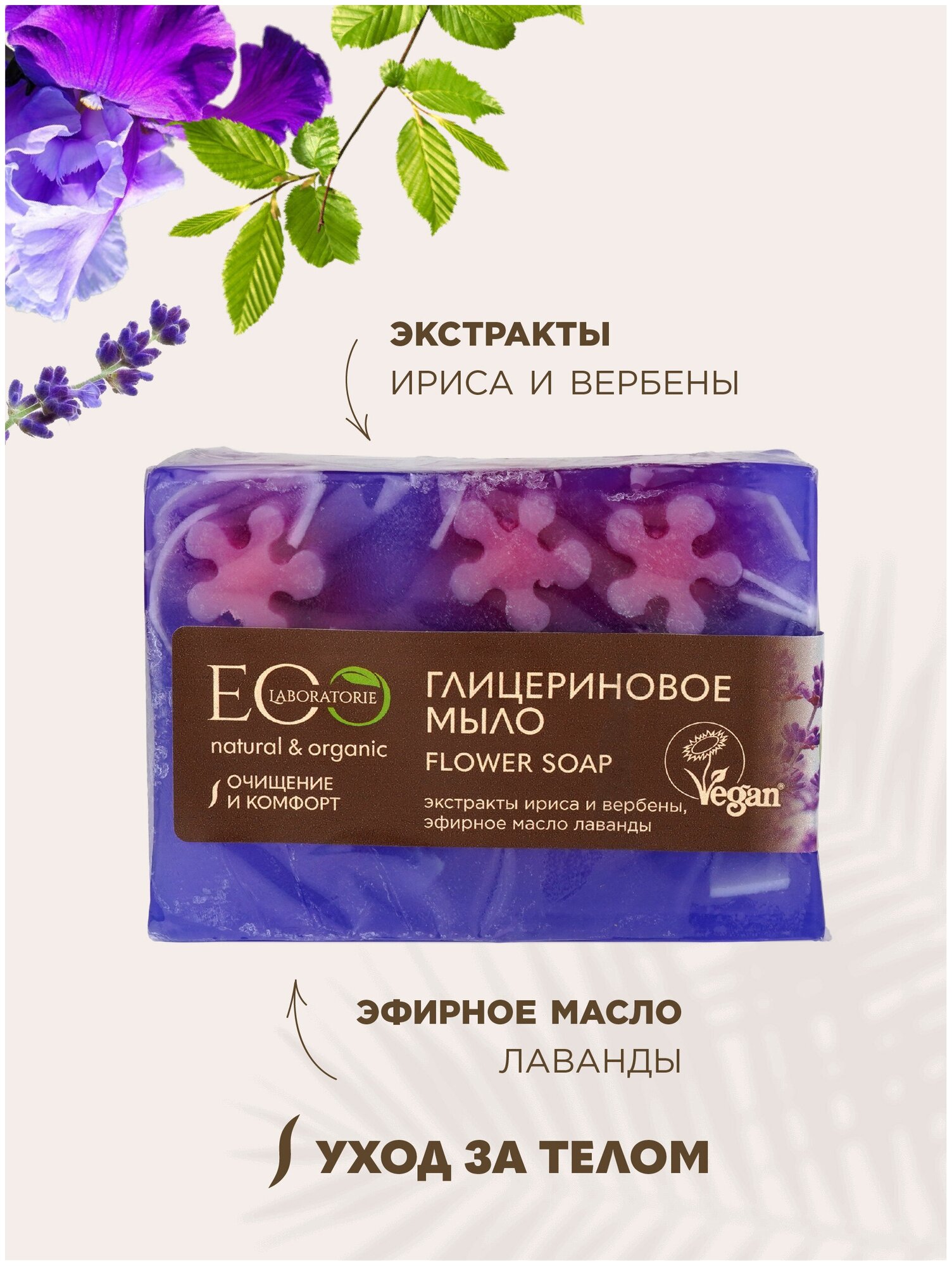 Глицериновое мыло ручной работы. Активные ингредиенты: масло вербены, масло лаванды, экстракт ириса. Нежное мыло Flower от Эколаб с цветочными маслами и экстрактами деликатно очистит кожу, подарит чудесный аромат, защитит от сухости и шелушения. Нежное мыло EO Laboratorie® с маслами и экстрактами деликатно очищает кожу, дарит чудесный аромат, защищает от сухости и шелушения.Активные ингредиенты:Экстракт вербены омолаживает, витаминизирует кожу, повышает упругость.Масло ириса активизирует выработку коллагена и эластина. Способствует удержанию влаги в клетках кожи, что так же является антивозрастным действием.