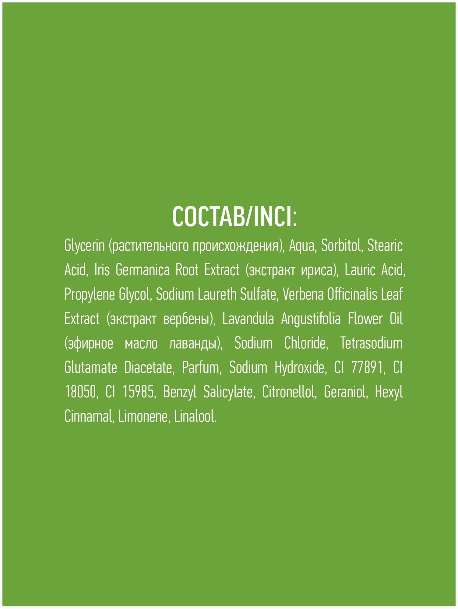 | Состав | Glycerin, Aqua, Sorbitol, Iris extract (экстракт Ириса), Stearic Acid, Sodium Laureth Sulfate, Propylene Glycol, Lavandula essential oil (масло Лаванды), Verbena essential oil (масло Вербены), Lauric Acid, Perfume, Sodium Hydroxide, CI 77891, CI 19140, CI 45350. |