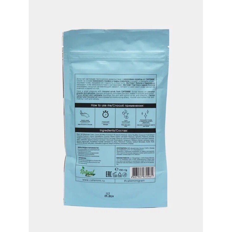 | Состав | maris sal (морская соль), cocos nucifera (сoconut) oil (масло кокоса), cocos nucifera (coconut) fruit extract (стружка кокоса), cereus grandiflorus (cactus) flower extract (экстракт кактуса), spirulina platensis powder (пудра спирулины), fucus vesiculosus extract (экстракт фукуса), laminaria digitata extract (экстракт ламинарии), laminaria japonica extract (экстракт японской ламинарии), sargassum pallidum extract (экстракт водоросли саргассум), tocopheryl acetate (витамин е), aqua, potassium sorbate, sodium benzoate, sorbic acid, parfume, benzyl salicylate, citronellol, eugenol, hexyl cinnamal, limonene, linalool |