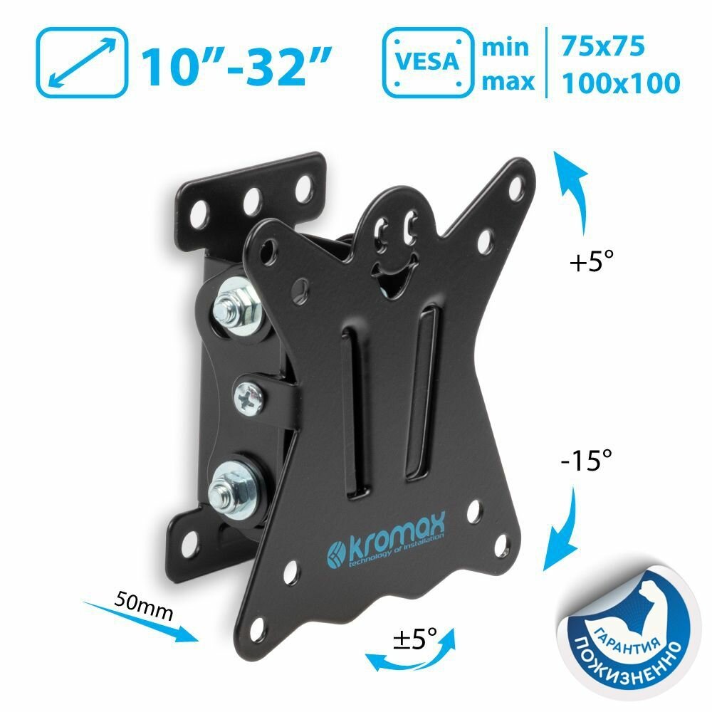 Кронштейн KROMAX позволяет закрепить телевизор или монитор на стене, выбрав оптимальный угол наклона его экрана. Он обеспечивает быстрый правильный монтаж устройства за счет применения съемной монтажной пластины и встроенного пузырькового уровня. В производстве кронштейна применяется высокопрочная сталь, за счет чего он выдерживает без повреждений очень большие нагрузки.