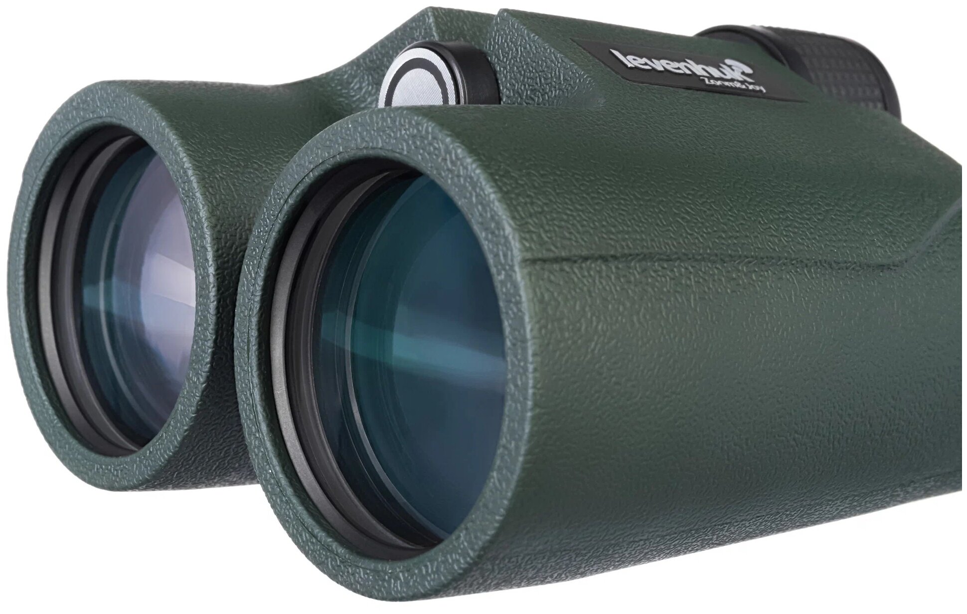 Бинокль Levenhuk легко подстраивается под особенности владельца: межзрачковое расстояние можно менять, на правом окуляре есть кольцо коррекции диоптрий. С помощью поворотно-выдвижных наглазников удобно регулировать расстояние от глаз до линз окуляров. Корпус покрыт плотной рельефной резиновой оболочкой защитного цвета, поэтому бинокль не скользит в руках.