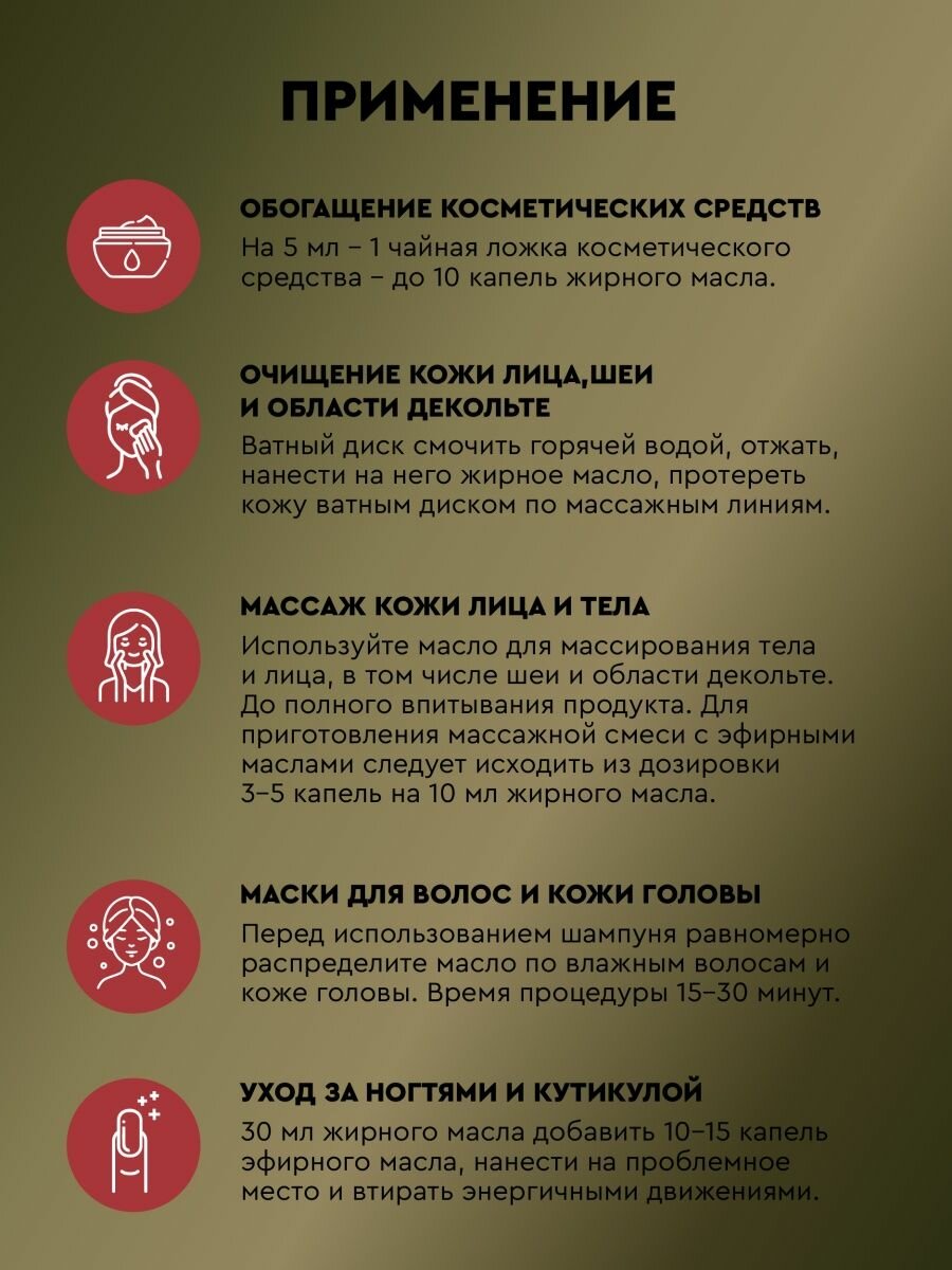 | Способ применения | Косметическое масло может использоваться в чистом виде, в смеси с другими растительными маслами или выступать в качестве основы для эфирных масел.Обогащение косметических средствНа 10 мл (2 ч.л.) косметического средства или на 100 мл шампуня или бальзама до 10 капель растительного масла.Маски для лицаНанести на лицо по массажным линиям. Время процедуры 15-20 минут.Очищение кожи лицаВатный диск смочить горячей водой, отжать, нанести на него жирное масло, протереть кожу ватным диском по массажным линиям.Массаж лица и телаМасло используется для непосредственного массирования тела, в том числе лица, шеи и области декольте.Пропорция обогащения базового масла эфирным маслом:5 мл (1 чайная ложка) базового масла 3-5 капель эфирного масла30 мл базового масла 12-30 капель эфирного масла50 мл базового масла 30-50 капель эфирного масла. |