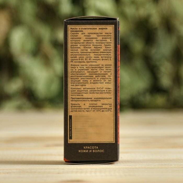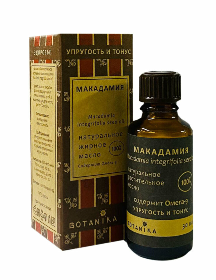 | Полное описание | Упругость и тонус (содержит омега 9)Сырьем для производства масла служат плоды тропического орешника макадамии, родиной которого является Австралия. К сегодняшней области произрастания дерева относятся Америка, Гавайи, Бразилия, Южная Африка. Химический состав включает жирные кислоты, преимущественно олеиновую, альмитолеиновую, пальмитиновую, калий, цинк, селен, медь, витамины группы В (В1, В2, В5, ниацин, фолат), Е, РР, минералы, протеины.Действие:-Заботится о сухой, зрелой, увядающей, утомленной коже, придавая упругость, повышая тонус, заряжая энергией и улучшая ее общие качественные показатели-Замедляет процессы старения, сокращает морщины, придает коже эластичность и возвращает здоровый цвет лица, демонстрируя свои антиоксидантные свойства-Устраняет раздражение и шелушение на сухой чувствительной коже, делая ее гладкой и мягкой-Подходит для бережного ухода за кожей вокруг глаз, оказывает заметный лифтинговый эффект-Используется в качестве средства для очищения кожи и снятия макияжа-Смягчает огрубевшую кожу локтей и ступней-Защищает кожу от внешнего воздействия окружающей среды в холодное время года, предупреждает обветривание-Успокаивает кожу после загара, минимизируя риск пересушивания кожи-Стимулирует рост волос, улучшая кровообращение кожи головы-Восстанавливает структуру ломких, пересушенных волос, придает им здоровый вид и шелковистость. |