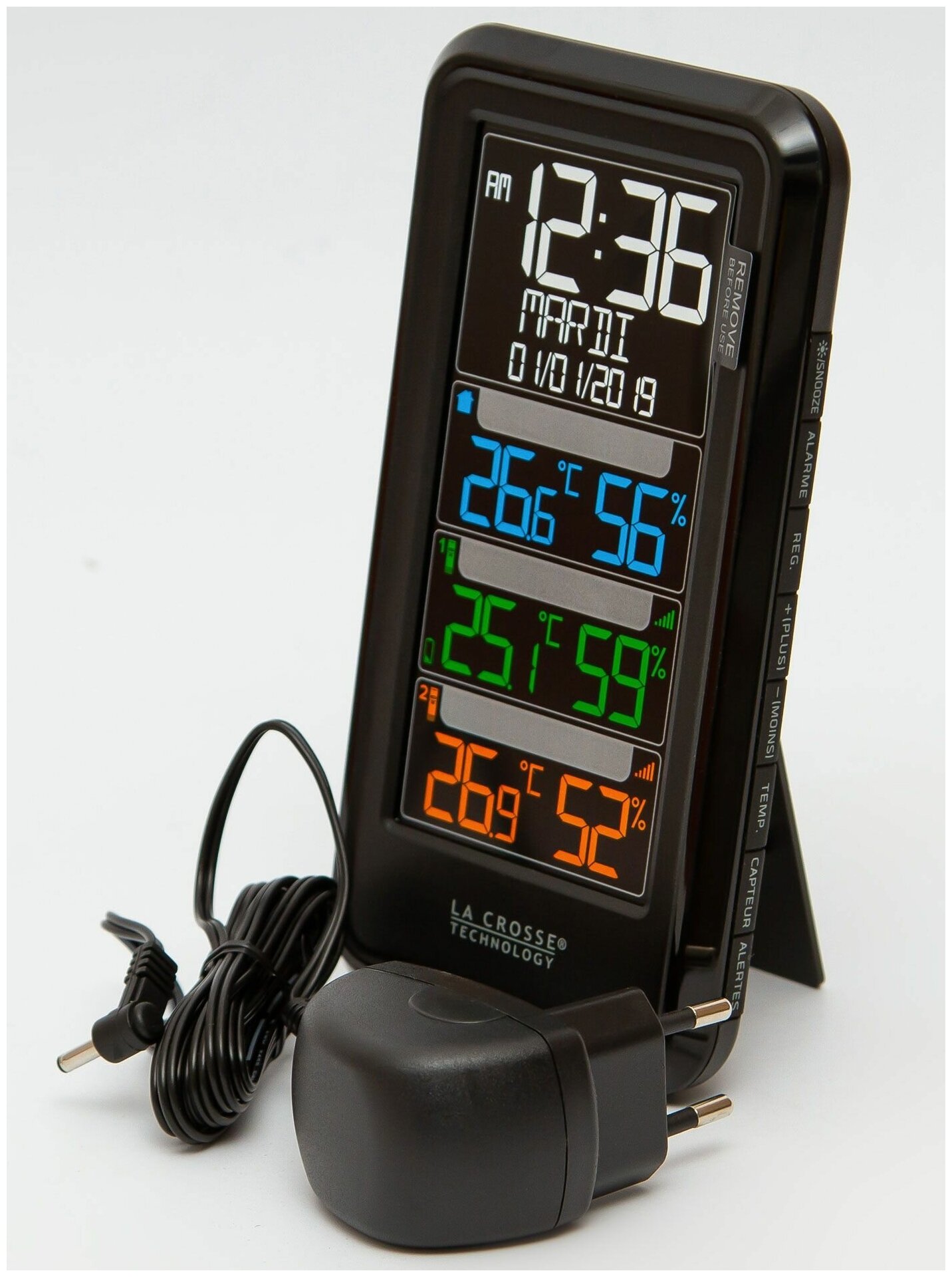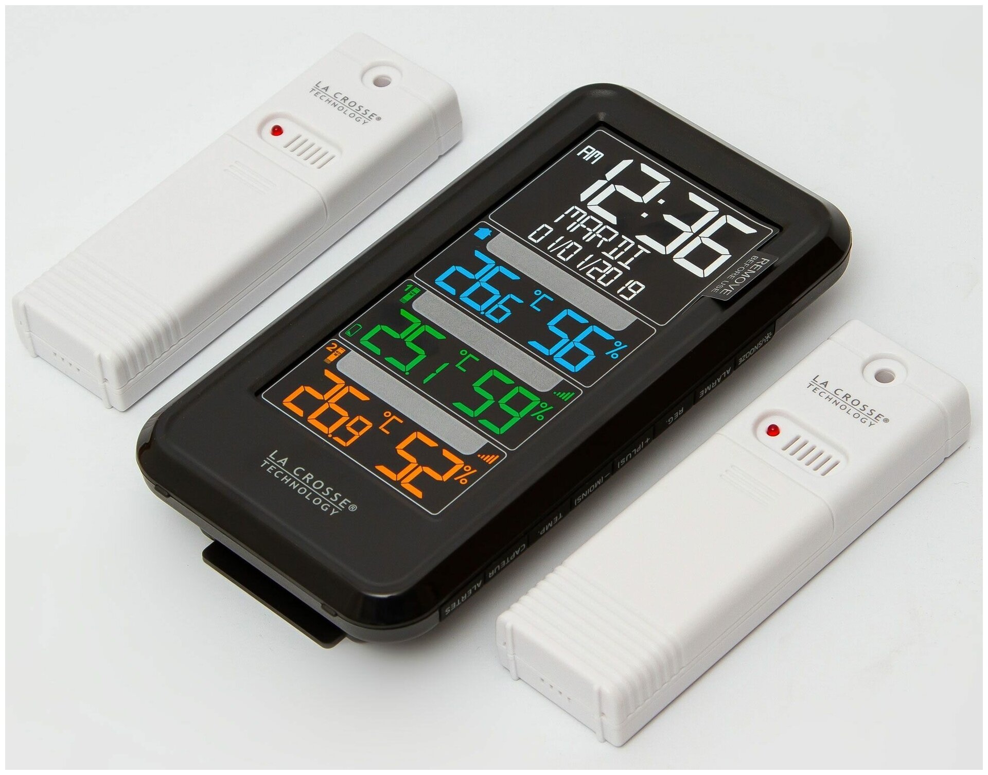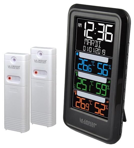 Цветная погодная станция с двумя датчиками La Crosse (Ла Кросс) используется для измерения температуры и уровня влажности воздуха в помещении и за его пределами. Прибор оснащен двумя датчиками, которые устанавливаются в необходимом для измерений месте. Информация с датчиков обновляется каждые 47 секунд и отображается на цифровом дисплее.