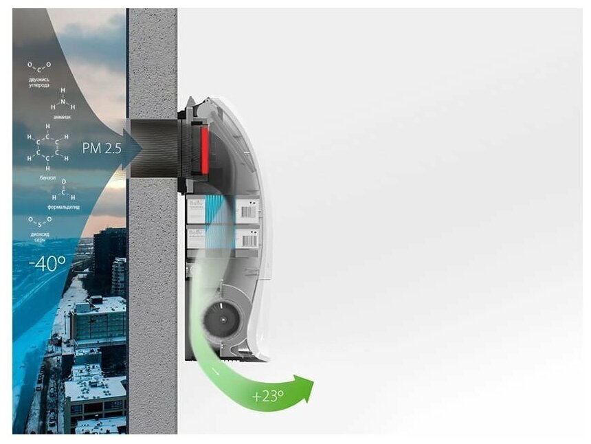 Предназначен для подачи свежего и очищенного воздуха в небольшие помещения, например, такие, как кухня или детская комната. Максимальная производительность — 80 м³/ч. Высокоэффективная фильтрация за счет фильтра класса H13. Встроенный высокоэффективный керамический нагревательный элемент мощностью 600 Вт подогревает входящий воздух.