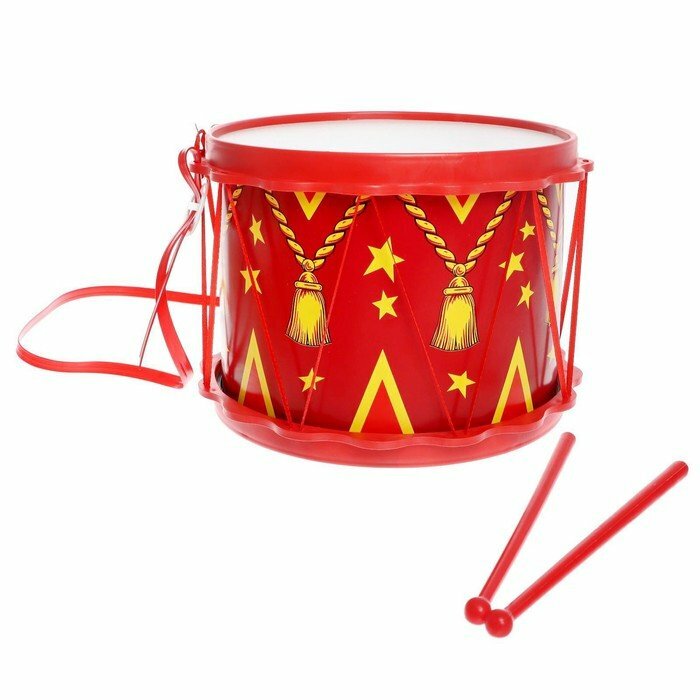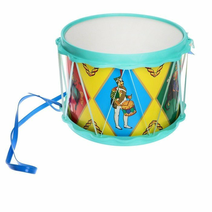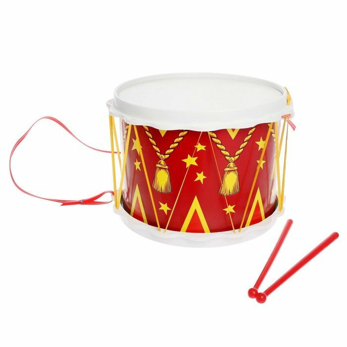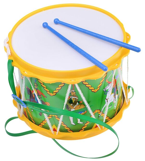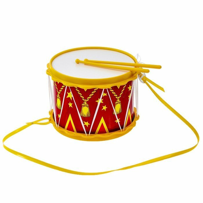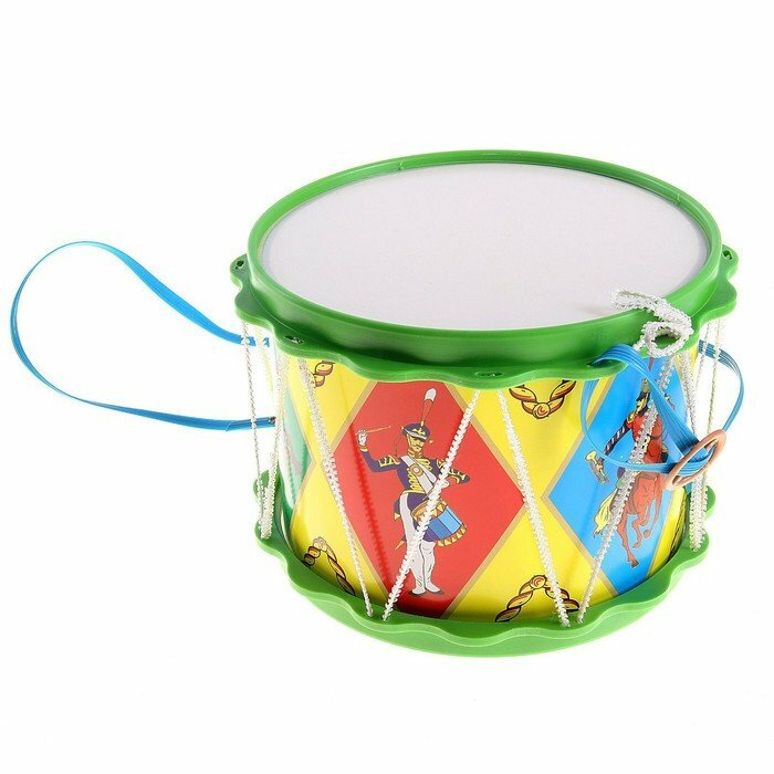 Красочный детский музыкальный инструмент, изготовленный в виде походного барабана, несомненно, поднимет ребенку настроение. В комплекте с барабаном можно найти 2 палочки. Благодаря ленточке, которая прикреплена к стенкам инструмента, его можно повесить на шею.