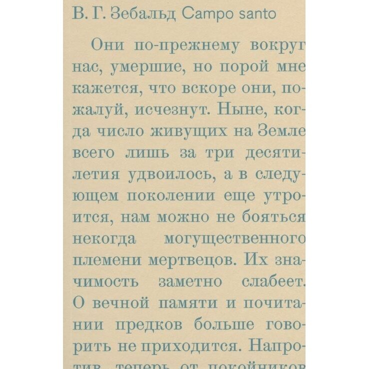 В.Г. Зебальд не успел получить нобелевскую премию, однако в сердцах читателей по всему миру занимает достойное место. «Campo santo», – это попытка сделать окружающий мир более осмысленным. Собственно говоря, как все сюжеты книг Зебальда, это книга, учит заботе друг о друге. Заботе не только о живых, но и ушедших. Произведений автора осталось немного, но зато ощущений, на сотни томов.