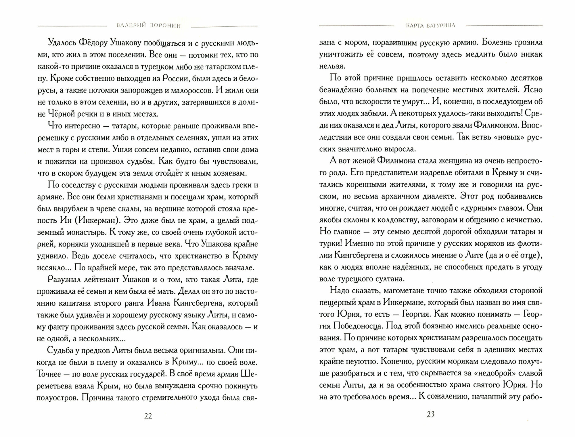 Роман "Карта Батурина" открывает новую историческую серию книг писателя В. Воронина "Книга Образов". В ней идёт речь о поиске и обретении той Книги и тех знаний, постичь которые многие поколения людей стремятся на протяжении всего времени существования нашей цивилизации. Пытливый ум главного героя "Карты Батурина" севастопольского журналиста Леона (Леонида) Лайна помог ему, опираясь на знания исследователя Крыма и друга Кирилла Руданского, докопаться до невероятных тайн прошлого…