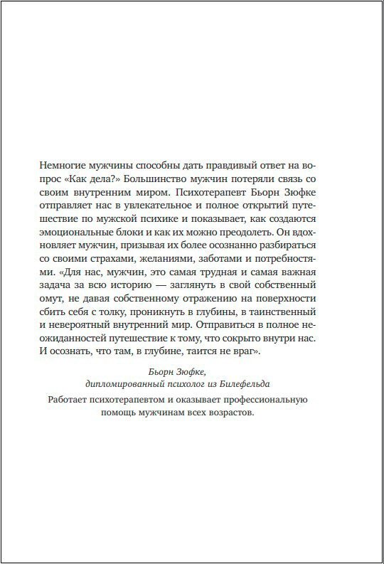 Психотерапевт Бьорн Зюфке аккуратно и с юмором исследует эмоциональный мир мужчин. В многочисленных примерах из практики доктора мы увидим, что представителям сильного пола с детства навязывают стереотипы, из-за которых они не могут проявлять слабость и почти во всем чувствуют конкуренцию.