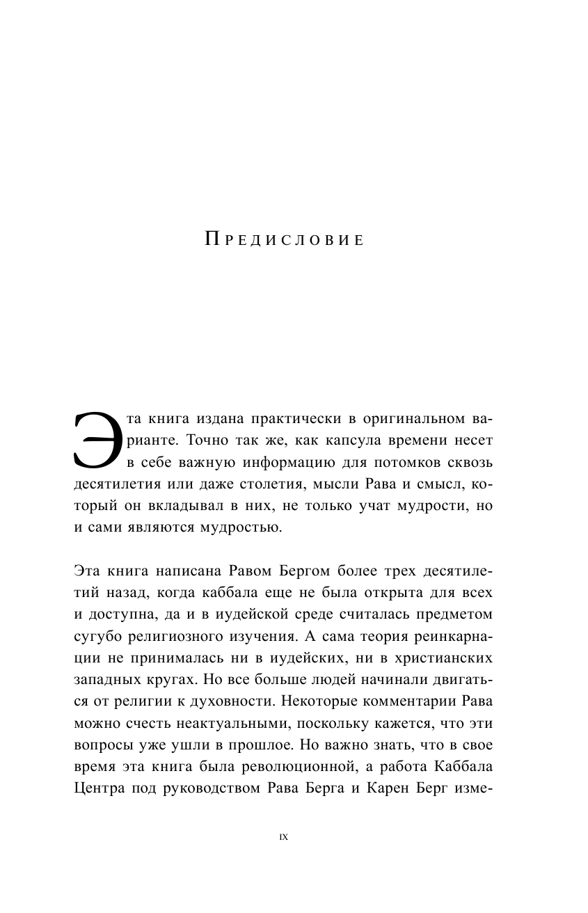 Современный каббалист Рав Берг в этой поистине революционной книге говорит о важном и неизведанном — рождении, смерти и жизни после смерти. Уводя нас от правил привычного несовершенного мира, автор раскрывает сакральные законы перевоплощения души, знание которых приводит человека к более глубокому и осознанному отношению к жизни. Книга содержит знания об устройстве Вселенной и цели перевоплощения душ на Земле.