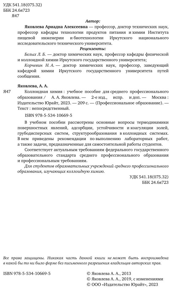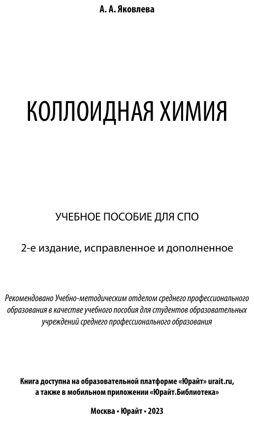 Коллоидная химия 2-е изд. испр. и доп. Учебное пособие для СПО (Ариадна Алексеевна Яковлева); ЮРАЙТ, 2019