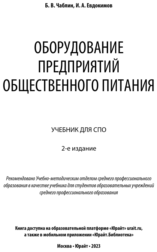 Оборудование предприятий общественного питания 2-е изд. Учебник для СПО (Чаблин Борис Владимирович; Евдокимов Иван Алексеевич); ЮРАЙТ, 2019
