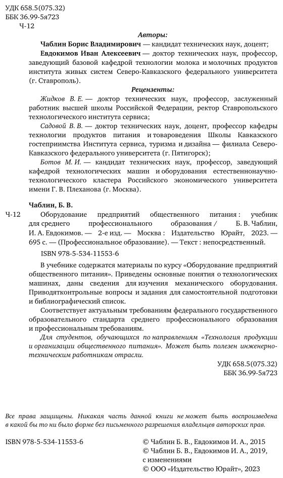 Сервис сравнения цен СкидкаГИД предлагает сравнить цены на товар «Книга: Оборудование предприятий общественного питания 2-е изд. Учебник для СПО (Чаблин Борис Владимирович; Евдокимов Иван Алексеевич); ЮРАЙТ, 2019»
