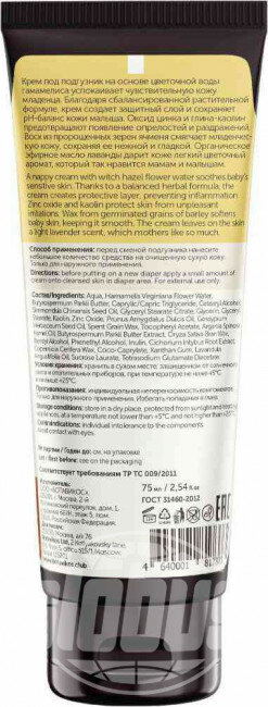 | Полное описание | Благодаря сбалансированной растительной формуле крем на основе цветочной воды гамамелиса не только успокаивает чувствительную кожу младенца, но и создает защитный слой на нежной коже малыша, снижая трение и предотвращая появление опрелостей.-Оксид цинка и каолин (глина) предотвращают появление опрелостей под подгузником и сохраняют рН баланс детской кожи.-Воск из пророщенных зёрен ячменя оберегает кожу от неприятных раздражений и сохраняют мягкость и гладкость детской кожи.-Эфирное масло лаванды создает нежный цветочный аромат, который так нравится мамам.предотвращает опрелости и смягчает кожуформирует защиту деликатных участков кожи. |