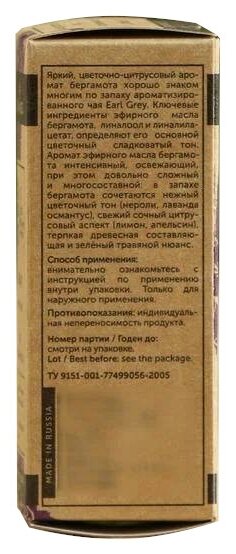 | Полное описание | Это нежное эфирное масло получают из кожуры плодов бергамота, напоминающего миниатюрное дерево апельсина. Его свежий сладкий фруктовый аромат с пряно-бальзамическим послевкусием можно отнести к самым праздничным и солнечным запахам.В косметологии используют антисептические и заживляющие свойства бергамота.Является легким афродизиаком.Косметическое действие-обеспечивает уход за жирной кожей лица, регулируя работу сальных желез-борется с несовершенствами проблемной кожи, уменьшая сыпь, воспаления, осветляя пигментные пятна-гармонизирует баланс кожи, освежает, тонизирует-заживляет некрупные ранки, порезы, язвы-результативно при варикозном расширении вен на ранних стадиях-укрепляет волосы, снижает их ломкость и восприимчивость к внешним факторам-применяется при перхоти, псориазе, экземе кожи головыПсихо-эмоциональное действие-успокаивает, избавляя от чувства угнетенности и безысходности-веселит, раскрепощает, вселяет уверенность-является легким афродизиакомБытовое применение-оказывает репеллентное действие против комаров, мух и мошек-очищает и дезинфицирует воздух, устраняет запах табака, гари, домашних животных-используется при влажной уборке и дезинфекции помещений-устраняет дрожь от волнения или переохлаждения благодаря своей согревающей составляющей-устраняет зуд и отек после укусов насекомых-используется при влажной уборке и дезинфекции помещений-является природным ароматизатором воздуха. |