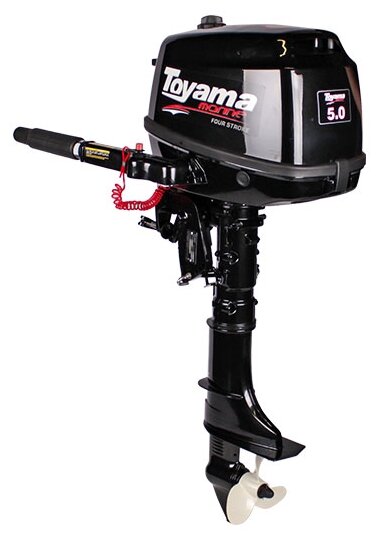 Подвесной лодочный мотор TOYAMA используется совместно с надувными лодками. Экологически безопасен , так как работает чисто на бензине, без добавления масла. Четырехтактный двигатель имеет длительную эксплуатацию. Это экономит денежные средства на техническое обслуживание. Дополнительные характеристики Тип двигателя/охлаждение: 4-тактный/водяное Мощность двигателя, (кВт/л. с.): 3,68/5 Гребной винт: 3-7½" х7 " Переключ. передач (Вперед-F, Нейтраль-N, Назад-R): F/N/R Объем топливного бака, (л): 1.3 Максимальный расход топлива, (л/ч): 2 Тип системы зажигания: TCI Объем масла в картере, (л): 0.5 Объем масла в редукторе, (см³): 100 Передаточное число редуктора: 27/13