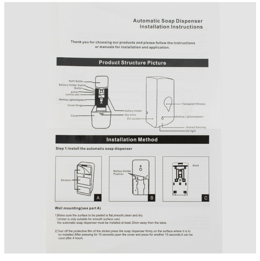Настенный, автоматический сенсорный дозатор, предназначен для бесконтактной обработки рук антисептиком, предназначен для установки в любых санитарно-гигиенических комнатах. Имеет ключ и пластиковый замок. Дозатор прост в эксплуатации, достаточно поднести ладонь к сенсору для получения порции средства. Автоматическая подача – предотвращает распространение микробов, вызванных прикосновением. Для удобства контроля за уровнем средства на лицевой поверхности есть смотровое окно в виде капли. Корпус диспенсера изготовлен из прочного пластика АБС белого цвета, который выдерживает различные механические воздействия. В резервуар емкостью 1000 мл можно заливать как антисептик, так и прочие средства. Разместив диспенсер на стене, достаточно время от времени проверять заполненность резервуара. Это отличное решение как для частных владений, так и для гостиниц, кафе, столовых и прочих общественных мест. Питание от 4-х батареек АА (в комплект не входят). Габаритные размеры: высота 270 мм, ширина 125 мм, глубина 125 мм. Вес - 1,100 кг.