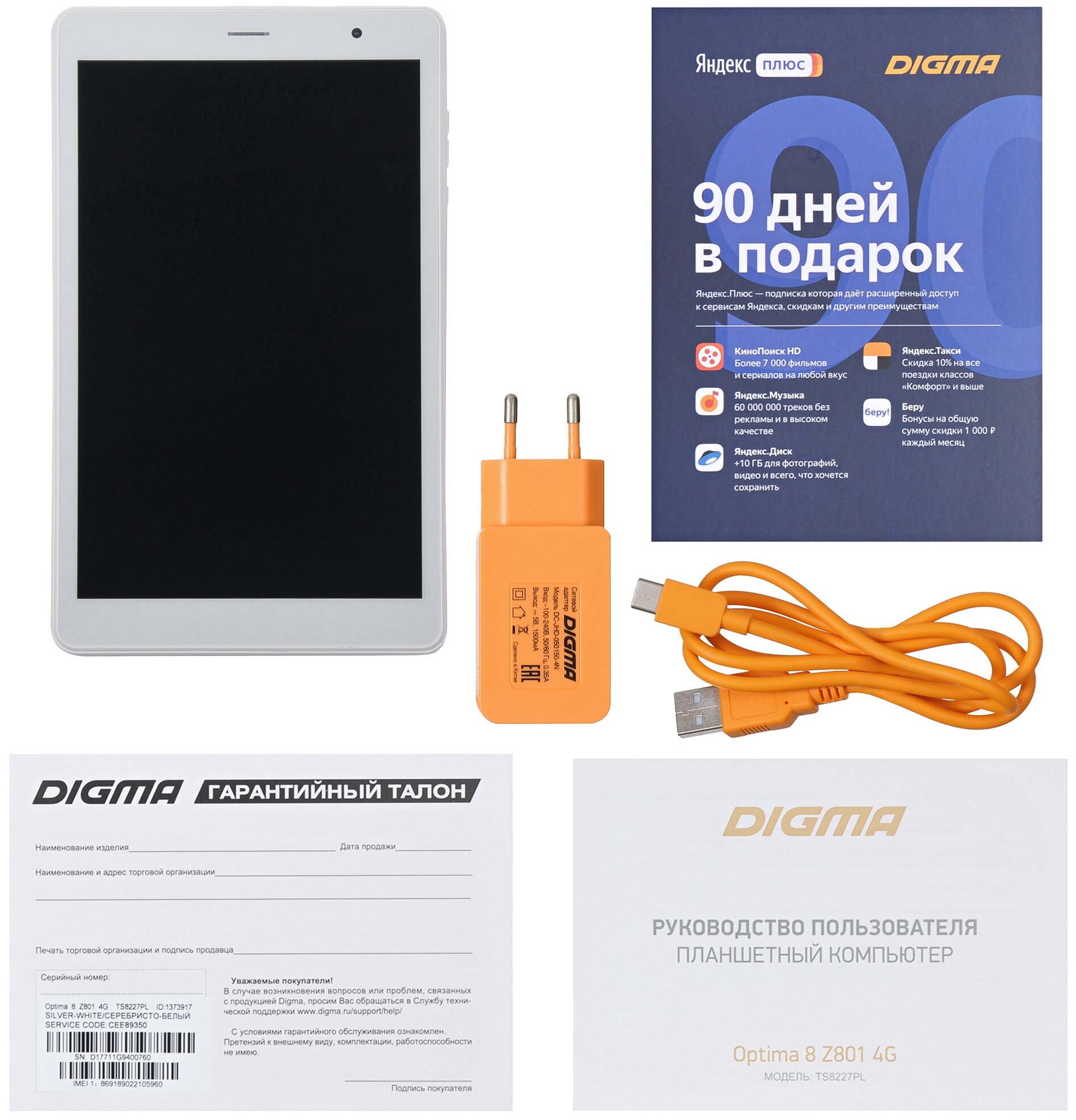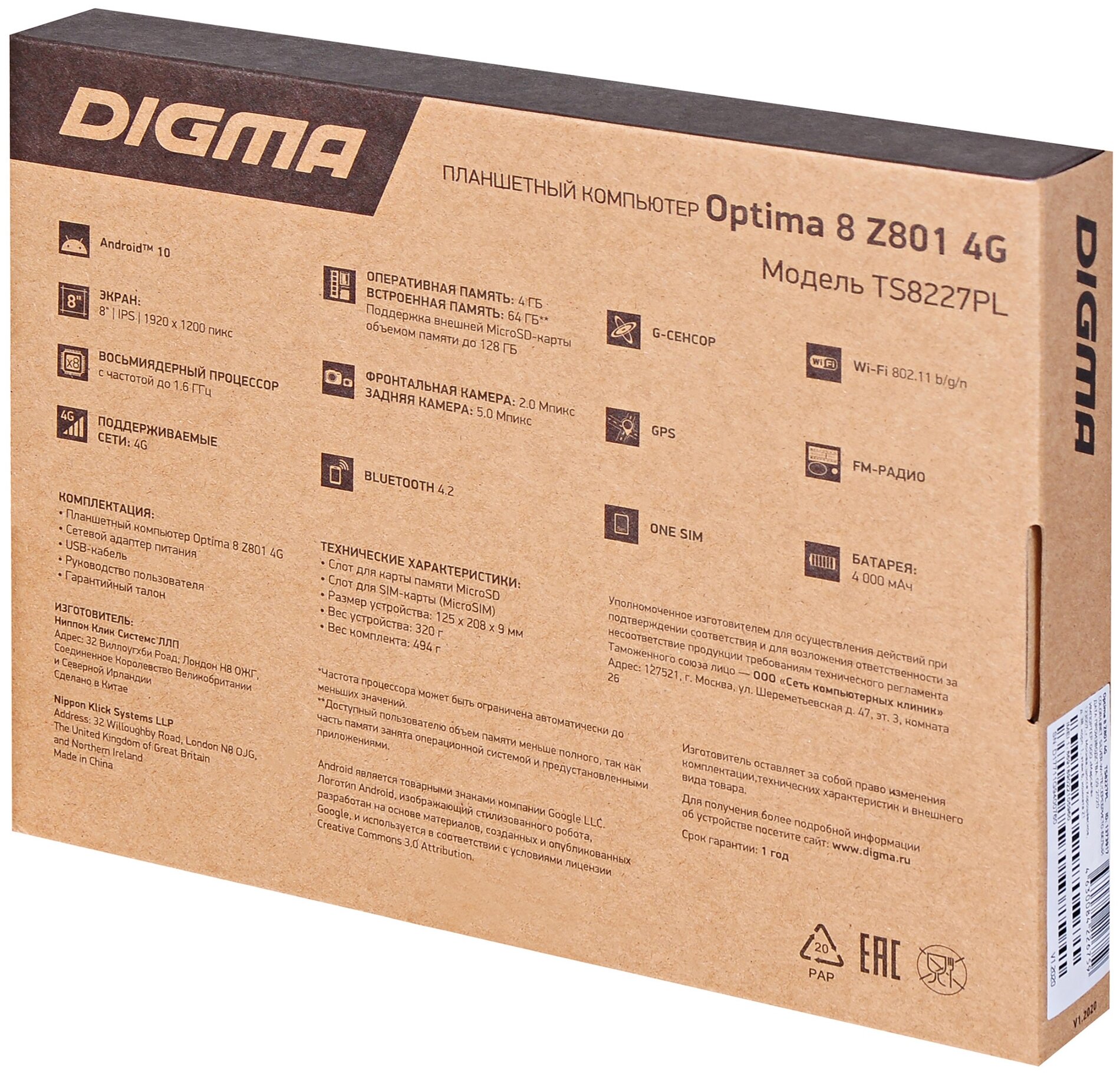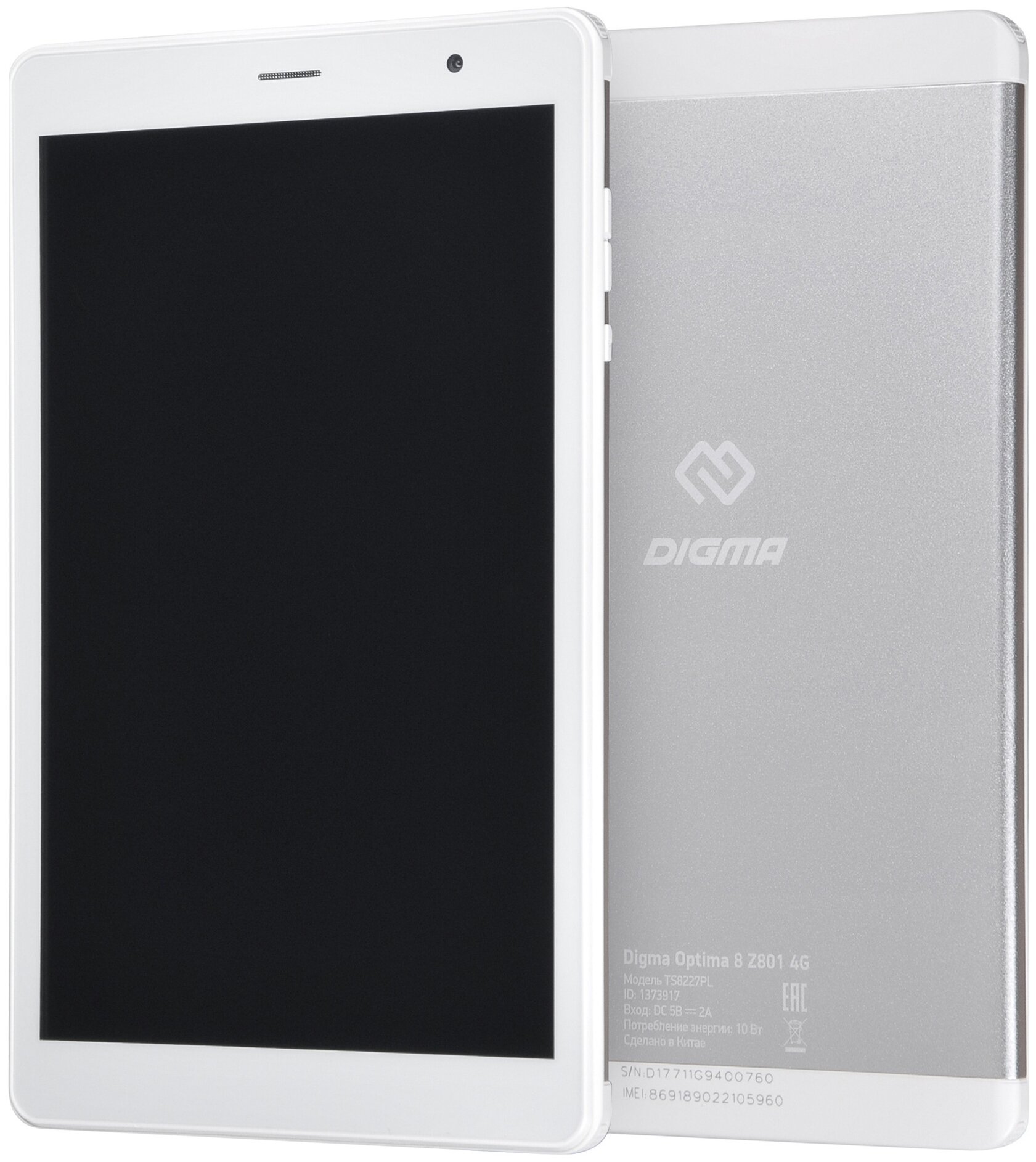 | Полное наименование | Планшет DIGMA Optima 8 Z801 8(1920x1200)LTE IPS Cam(5,0/2,0) SC9863 1,6ГГц(8) (4/64)Гб A10.0 4000мАч Серебристый/Белый TS8227PL |