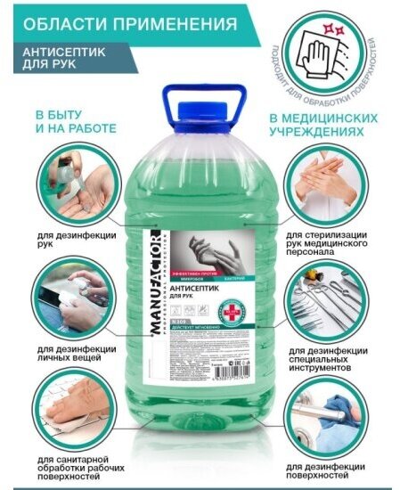 На сегодняшний день товар «Антисептик Manufactor для рук и поверхностей 5л [n30901] Noname» можно купить с кешбеком в 1 магазине: Яндекс.Маркет