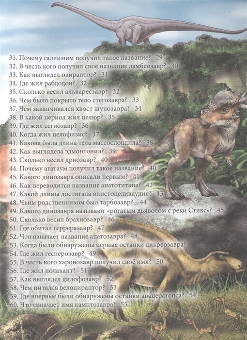 Вопросы приводятся интересные, рассказывается о различных динозаврах, хочется всё-таки узнать ответы. Не хватает структурированности информации, т.е. вопросы разрозненные, все обо всем. В целом, хорошая книга, рисунки красивые, цена привлекательная. На мой взгляд, книга для среднего школьного возраста.
